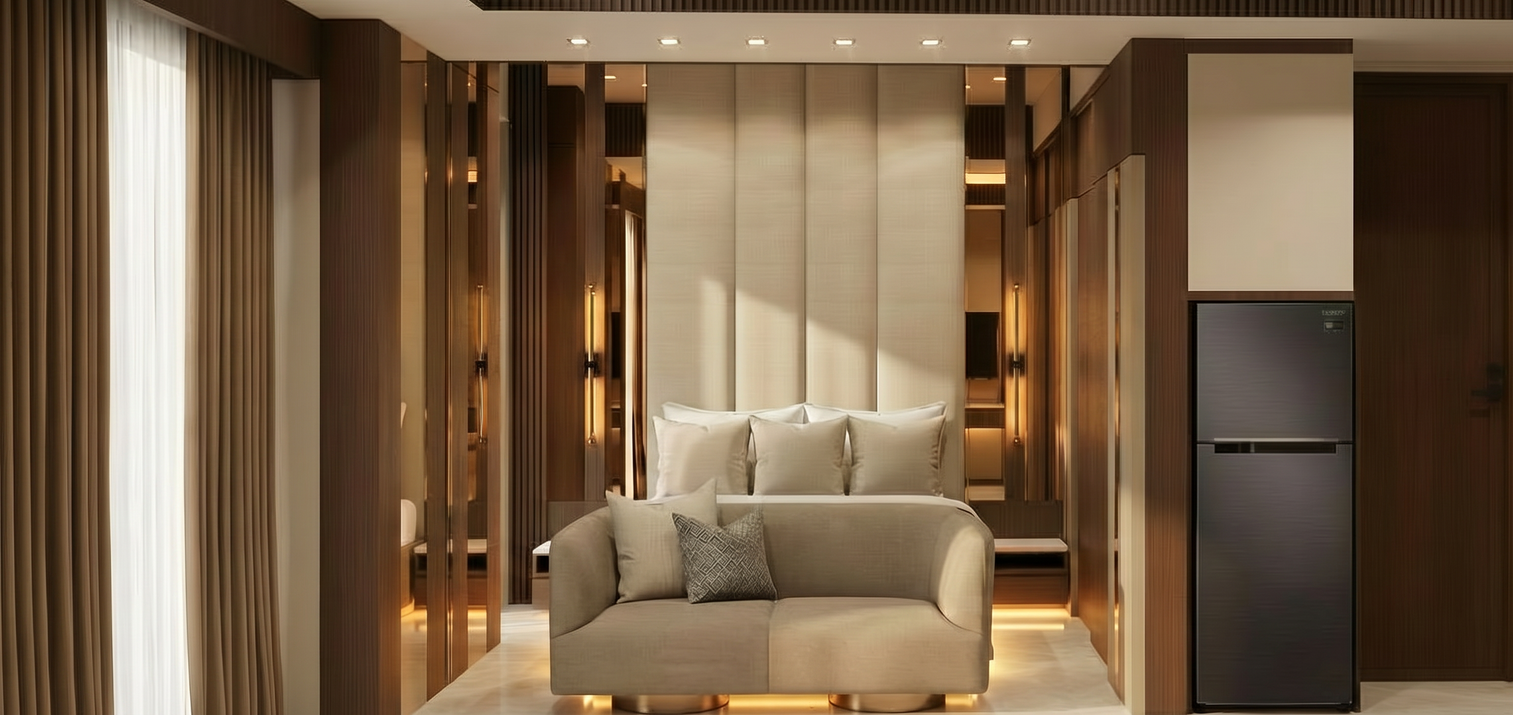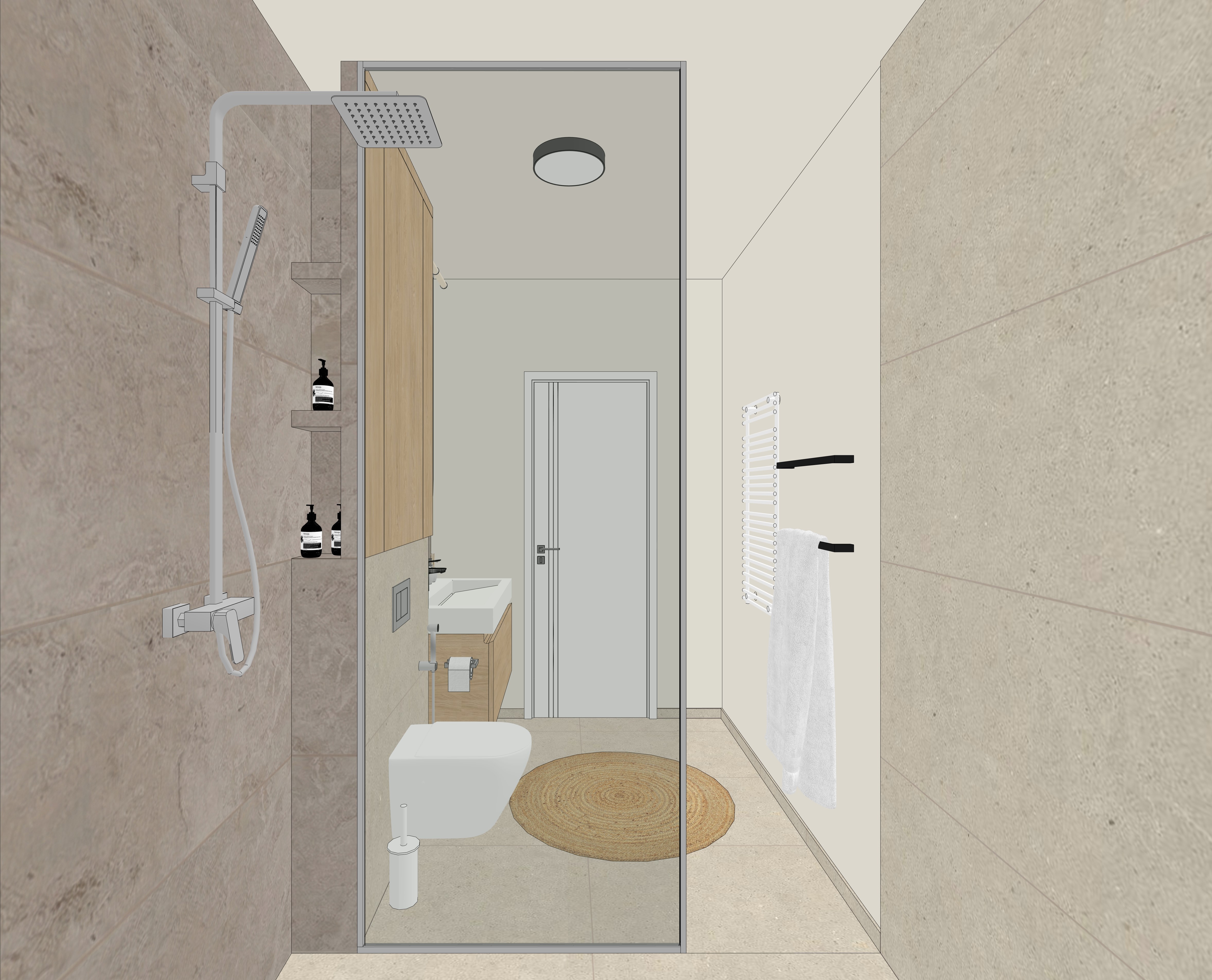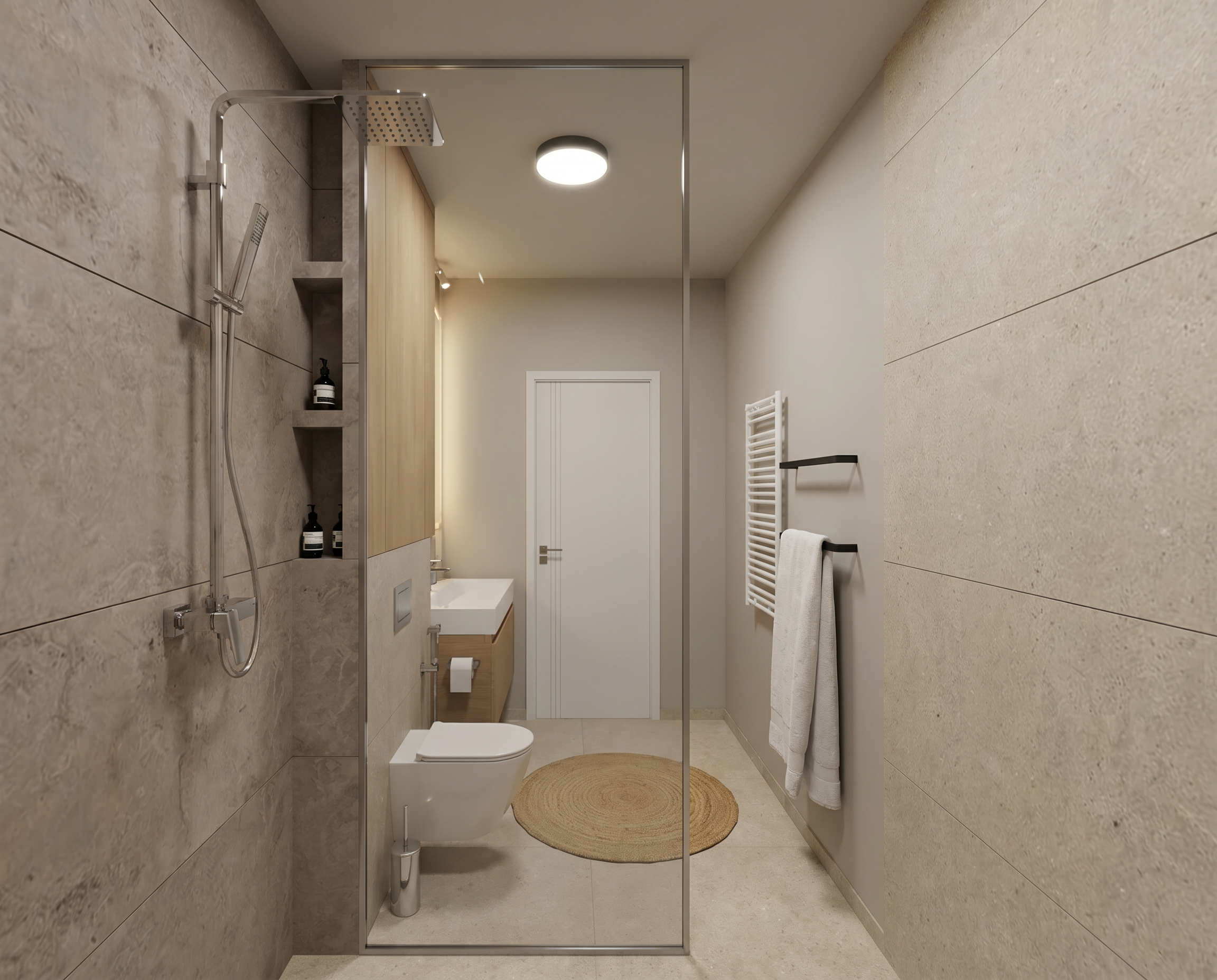 act as a world class architectural visualizer and 3ds max corona renderer master i am providing an image of a 3d bathroom scene taken from a frontal perspective i need you to generate an ultra photorealistic architectural render based exactly on this geometry and layout do not change anything in the scene preserve exact layout proportions camera angle materials object placement and composition materials strict preservation ceramic tiles on walls and floor natural beige stone look subtle texture variation keep all grout lines visible correct spacing and slightly darker than tiles wooden vanity and cabinet with natural wood grain soft matte finish realistic imperfections entrance door in white matte paint flat finish no gloss preserving exact vertical line detailing panel pattern as in the original 3d model the front wall right must be preserved exactly as in the original image light greige color warm beige grey matte paint finish no texture change ceiling must be light greige same tone family as right wall smooth matte finish uniform color all metal elements must be chrome sink faucet shower system toilet flush plate accessories physically accurate reflections slightly imperfect towel hangers black matte metal toilet brush white matt shower screen must be clear transparent glass not frosted with realistic reflections refraction and subtle edge highlights object details strict preservation hygienic shower bidet spray positioned next to the toilet must be present exactly as in 3d chrome finish flexible hose correctly mounted and proportioned lighting very important neutral ceiling light 4000k diffused and even mirror light fixture emitting warm light slightly stronger contrast vs ceiling light physically accurate global illumination corona style realistic light bounce soft contact shadows natural falloff realism details subtle roughness variation on ceramics micro imperfections on wood grain slight unevenness chrome with realistic reflections not perfect mirror slightly used look transparent glass must show realistic thickness reflections and refractions soft ambient occlusion in corners under vanity and near floor accurate contact shadows and edge definition camera render settings eye level perspective same framing as reference realistic exposure balanced whites no overexposed highlights cinematic dynamic range sharp but natural no over sharpening style ultra photorealistic high end architectural visualization corona renderer look clean minimal natural tones no added objects no styling changes no redesign