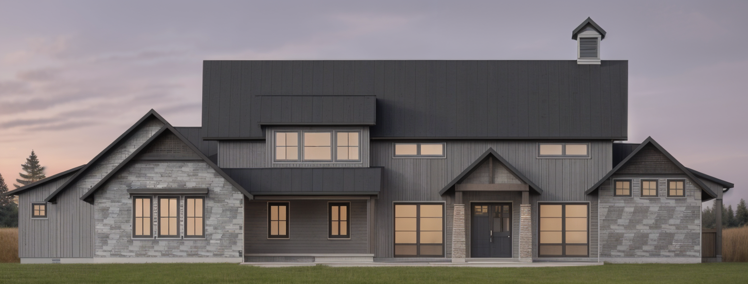 barndominium make roof dark gray make siding dark gray make stone light gray make siding brown make trusses brown architecture