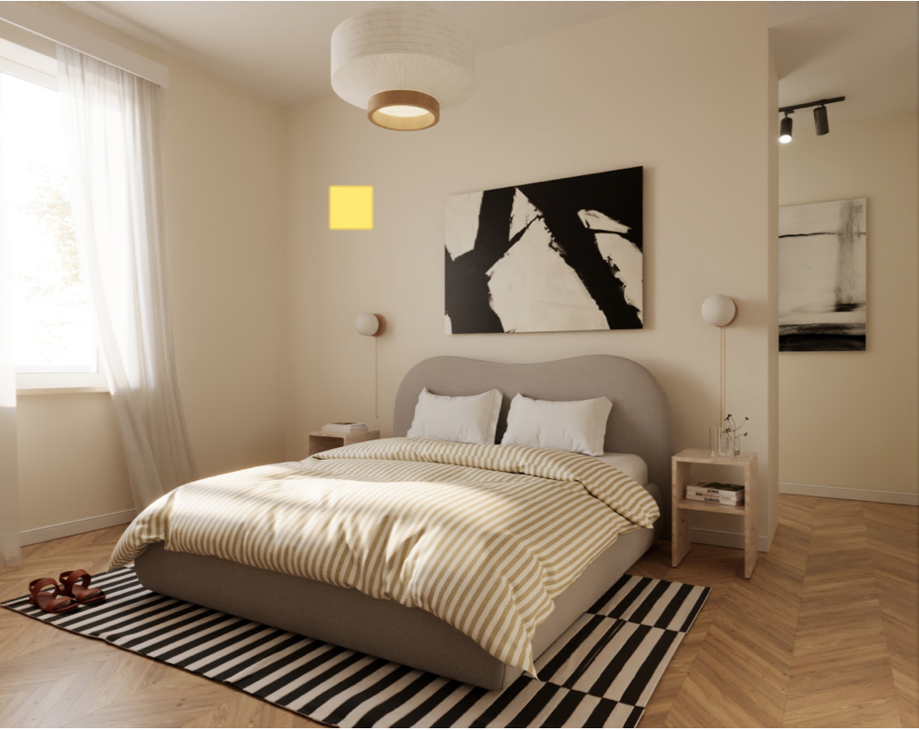 change the wall behind the bed with a sage colored wall with a simmetric boiserie in the same color