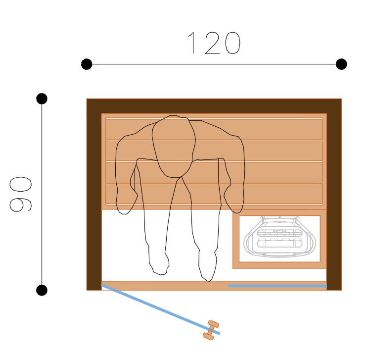 the plan shows a sauna from the top use wood clear texture for the bench the handle and the frame of the stove use a light blue for the glass keep the dark brown for the section of the wall there is a man sitting on the sauna he is wearing just the suimsuit make it real