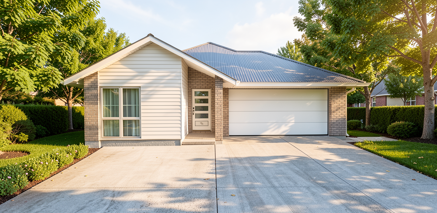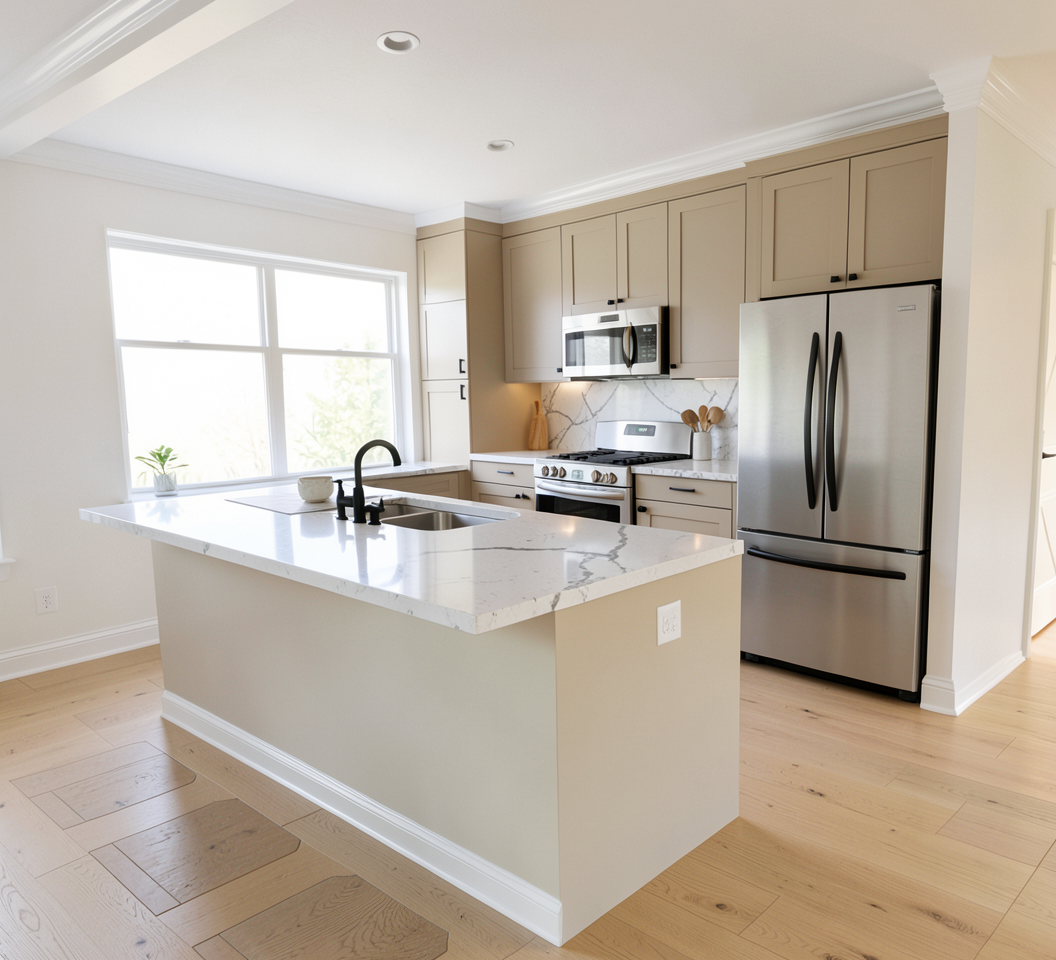 render this kitchen with sherwin williams canvas tan cabinets with black bar pull handles and black plumbing fixtures stainless steel appliances quartz countertop and backsplash with very light grey vein the floors should be light oak and walls to be sheetrock painted white the base molding to be glossy white