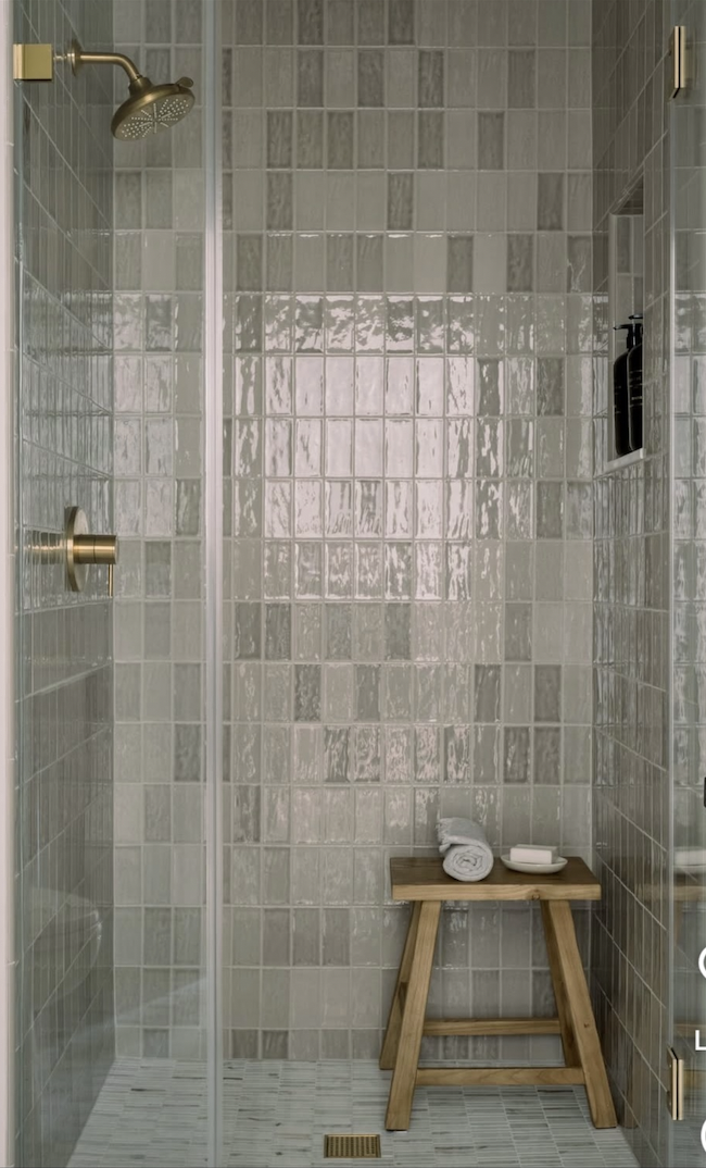 use blue subway tile in a vertical lay on the shower wall and ceiling use a white and blue penny round tile as the shower floor
