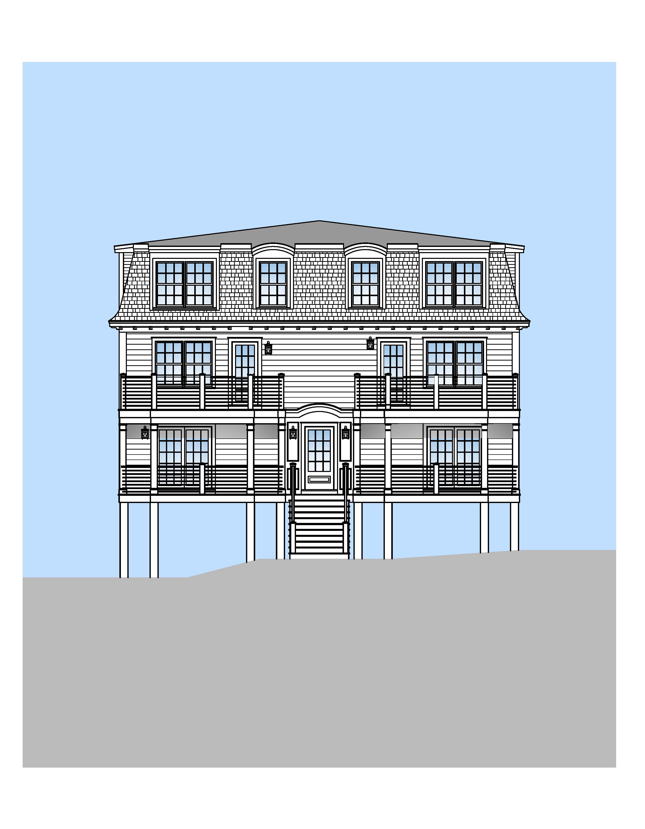 white siding black steel pilings black windows and doors horizontal wire railings beach landscape white deck columns add furniture to decks dark grey roof bring front door forward to front of decks no furniture on ground