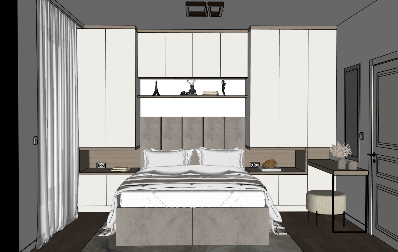 keep colors textures shapes don t change anything bottom of the bar is same color as front of the shelves make photo realistic with natural day light front of wardrobes are light beige light come from left side on right side under the make up table is mirror make brighter light beige on the wardrobe
