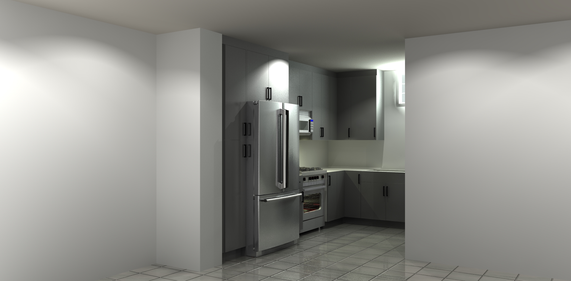 maintain original structure and colors flooring to be 24 x24 calacatta statuario gloss finish cabinets to have a high gloss grey finish make the countertop and full height backsplash white with black thick veins have backsplash go all the way up and around the window wall keep the size of the window