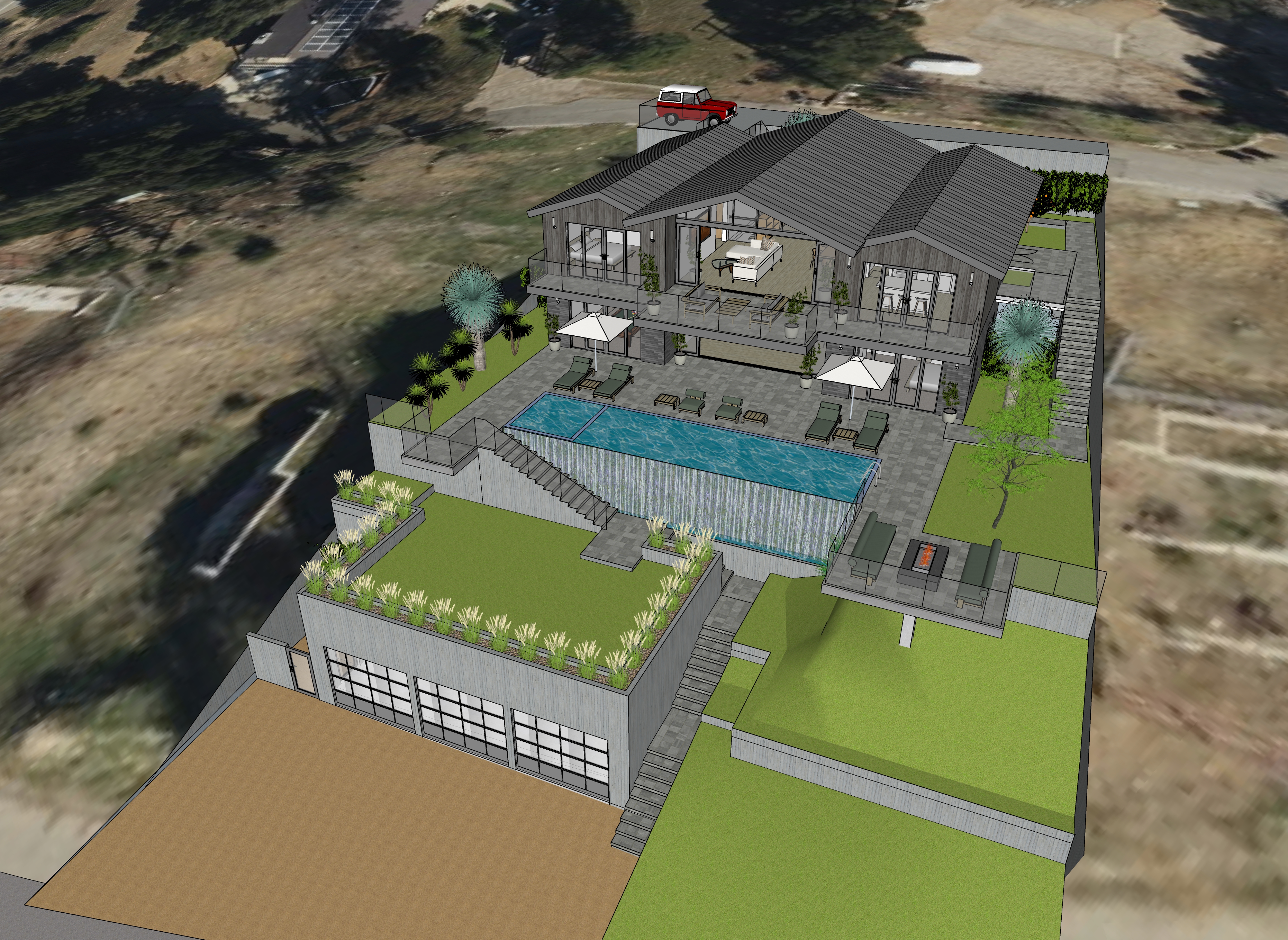 add california native plants grasses and flowers to the yard areas enhance the waterfall effect at the infinity edge of the swimming pool along the full length of the pool add a 2025 model vw buzz parked in the driveway on the left side make the driveway surface grasscrete add 3 children playing with a soccer ball on the lawn above the garage add people around the pool and swimming in the pool add a man and a woman walking up the stairs on the right side of the garage add a man walking down the stairs next to the waterfall add bushes and trees to the adjacent landscape like the area around malibu lake keep the lawn space at that is at the same level on the right end of the pool a grass area with a gas grill in the center of it and keep the two trees that are in the view add a man and a woman looking out from the center of the balcony at the upper level of the house enhance the roadway at the upper level of the view to make it look more realistic make it one lane wide and partially obscure it with bushes and trees open up the right side garage door and add a 1972 porsche 911 parked inside add 2 men on the driveway talking to each other with a medium sized dog sitting next to them add a small ranch style modern home on the adjacent parcel on the left side of the view partially obscured by trees and plants the planter along the outer edge of the garage walls keep the type of grass that is already in the view
