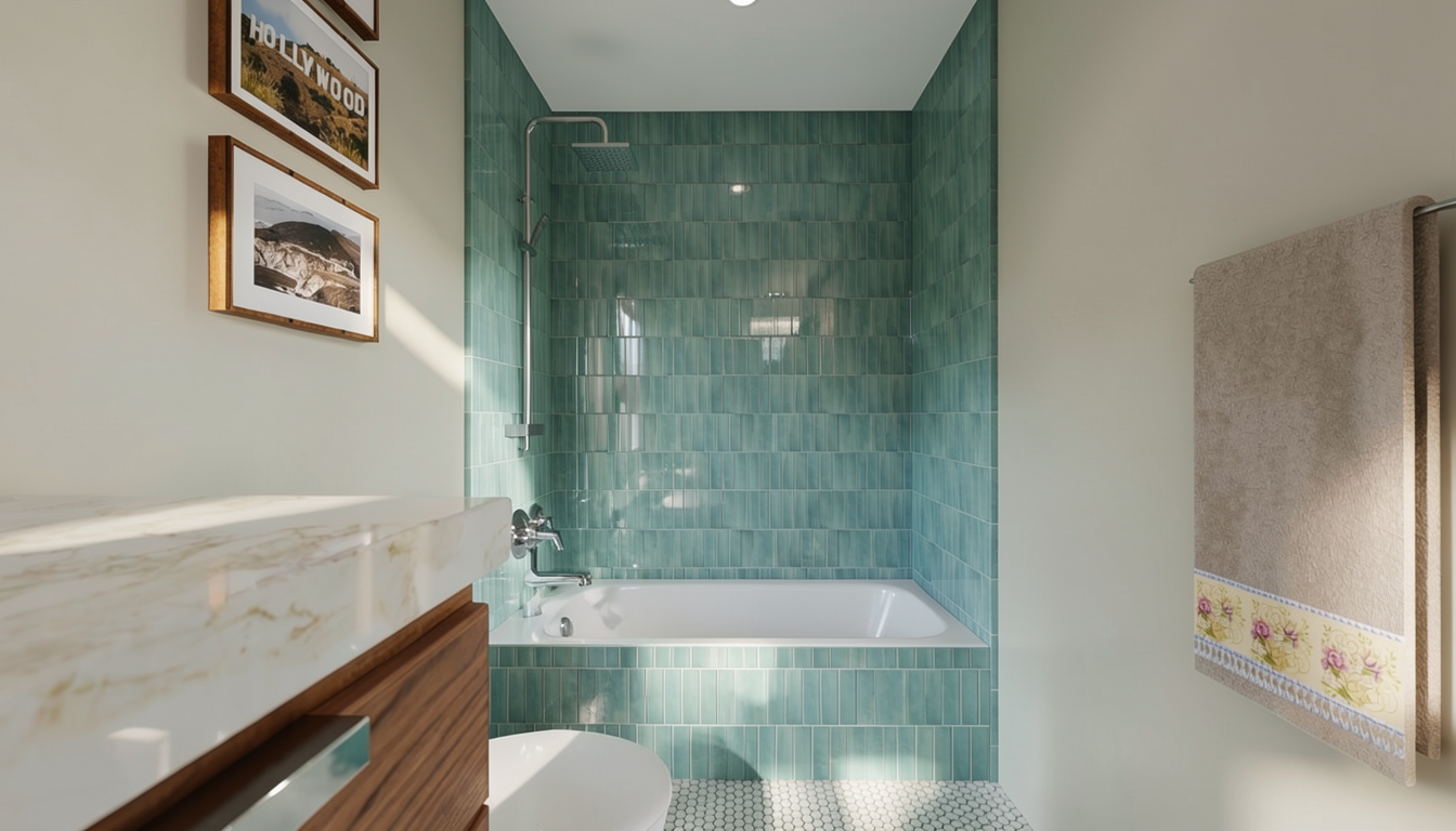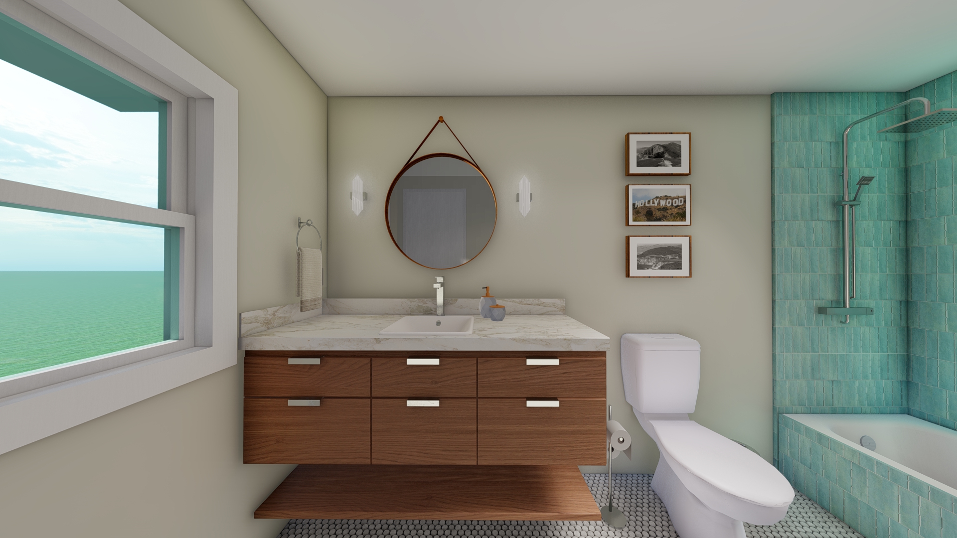 ultra realistic rendering of a modern bathroom maintain the exact layout camera angle proportions and object placement from the original photo do not modify the architecture d cor or composition enhance realism through accurate materials textures lighting reflections and shadows surface material definitions high fidelity vanity cabinetry warm natural wood with visible grain texture matte finish soft shadows under drawers realistic roughness countertop white marble with subtle gray veining soft reflections slight translucency natural stone shading sink faucet sink smooth white ceramic with soft gloss faucet polished chrome with accurate reflections and micro scratches mirror large round mirror with leather strap realistic glass reflections soft edge shading natural light bounce wall surface light neutral paint with smooth matte finish subtle texture variation and soft shadow falloff wall lights warm white illumination soft glow natural reflections on nearby surfaces realistic metal finish shower area rectangular teal ceramic tiles with glossy finish visible grout lines tonal variation slight surface irregularities realistic specular highlights and light bounce chrome shower fixtures with high fidelity reflections flooring small light tone hexagonal mosaic tiles natural grout depth slight unevenness soft ambient reflections wall art three framed photographs with thin black frames glass reflections and soft shadows on the wall towel realistic without decorative border replace the towel s decorative border with a clean plain finish beige cotton towel with no patterns or embroidery add natural fabric folds realistic thickness woven fiber texture soft shadows believable weight and draping maintain the towel s position and color tone only removing the border detail lighting parameters soft diffused natural light from the left warm ambient illumination from wall lights accurate reflections based on material roughness high precision global illumination natural color balance no stylization soft realistic shadow fallof