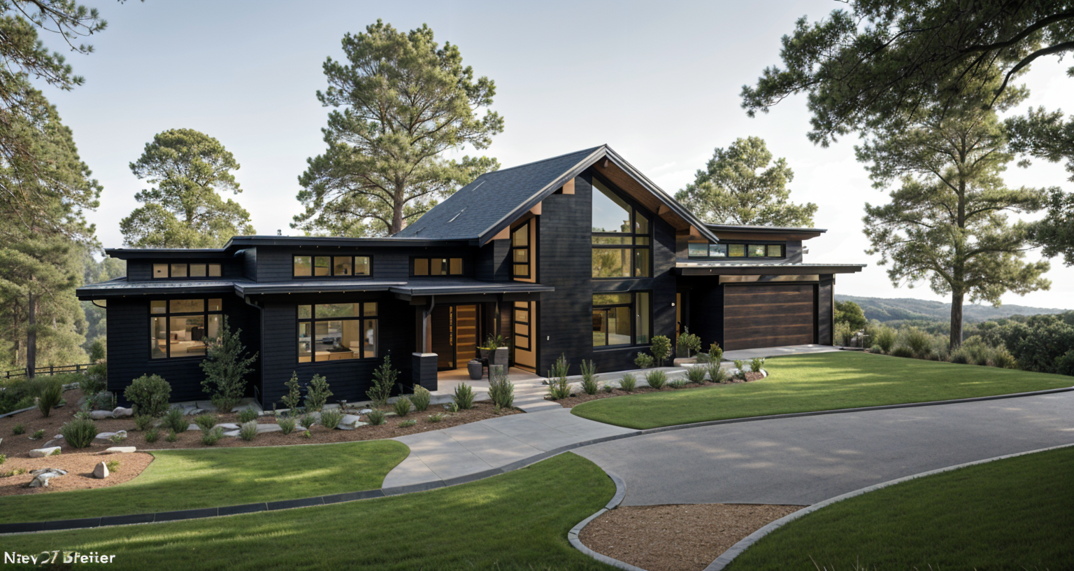 grainy watercolor rendering of house with black and medium tone warm wood siding surrounded by oak tree forest and leafy forrest floor dense forest background asphalt driveway where indicated architecture