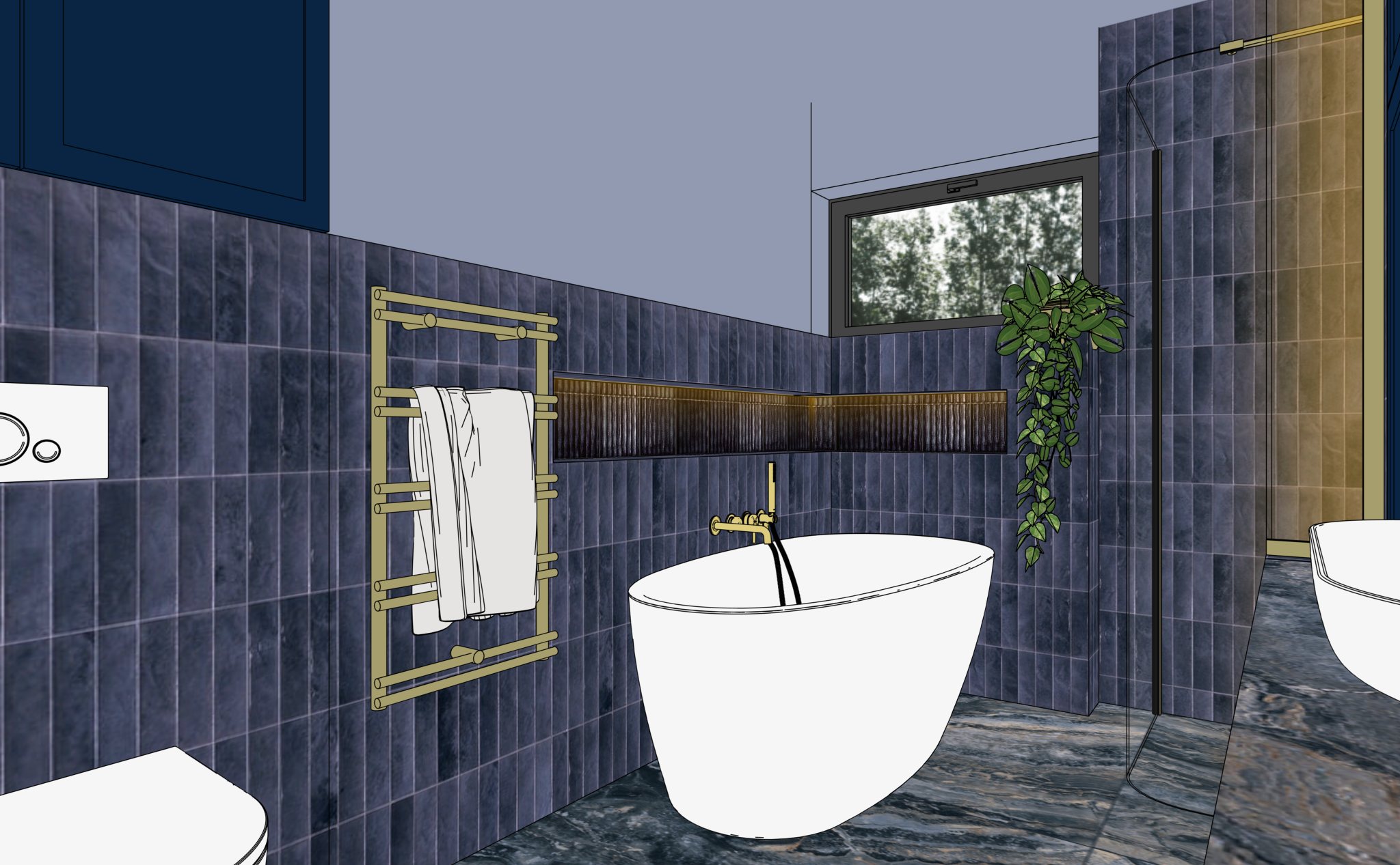 nie zmieniaj geometrii perspektywy tekstur mebli kolor w nie dodawaj adnych element w dekoracyjnych ani mebli pod prysznicem za ciank wieci pionowy profil led we wn kach nad wann jest pod wietlenie led szafki s lakierowane matowym lakierem wc i wanna s bia e matowe p ytki pod ogowe s matowe popraw wizualizacj eby by a hiperrealistyczna