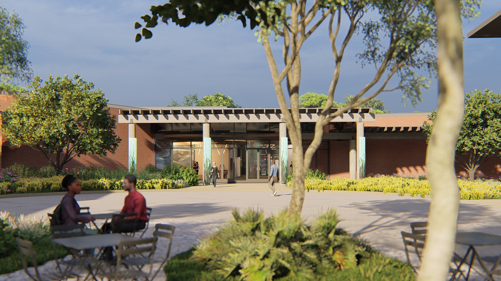 exterior shot an exterior shot of an outdoor space under a wood framed canopy with beautiful landscaped planters