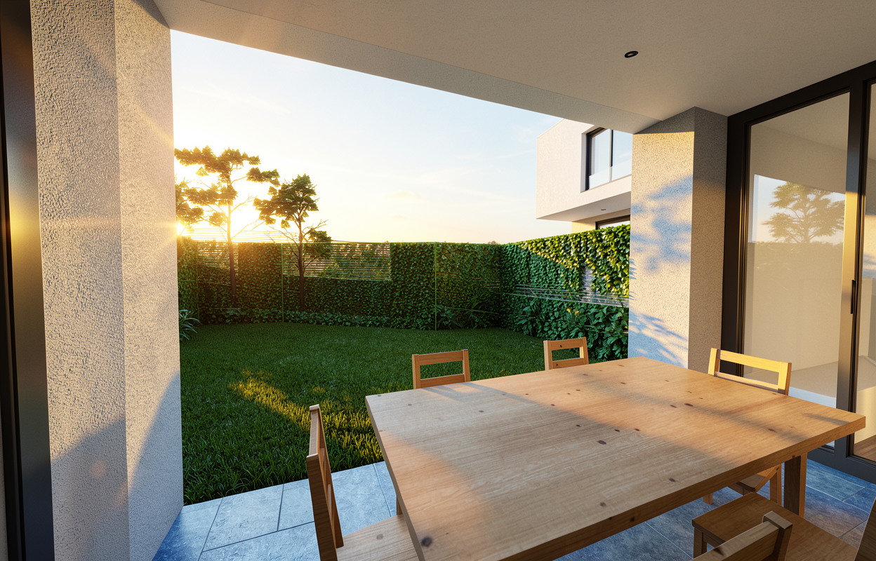 render a modern outdoor patio scene basking in the warm glow of a late afternoon sun the atmosphere is serene and inviting with soft golden sunlight casting gentle shadows across the scene elements architecture sleek white modern buildings with glass features adding a sense of openness walls textured light gray with subtle shadow play fence lush green ivy vibrant and healthy grass well manicured and deep green trees don t change the position of the trees and don t add further trees small mature and leafy providing additional depth with rich green foliage patio bluish gray stone tile flooring cool and elegant furniture natural oak wood table and chairs warm and inviting position of the sun sun high in the sky background don t add any buildings
