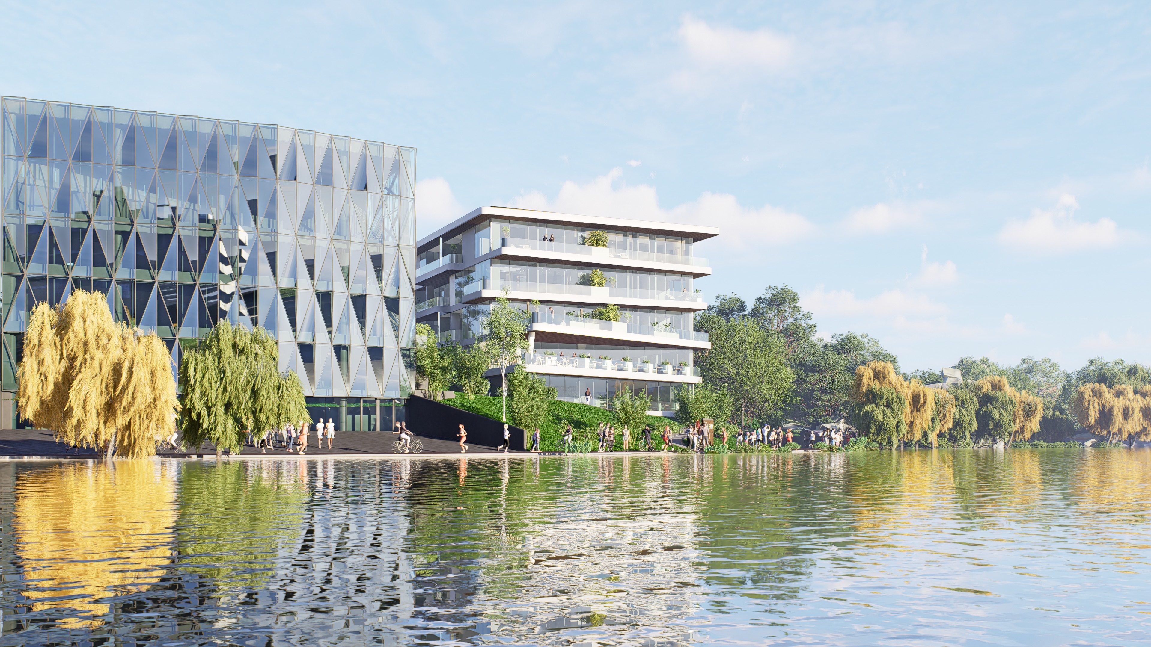 important to preserve the existing geometry and the existing context exactly as provided preserve the existing windows do not add new windows do not modify alter reinterpret add remove scale or reshape any geometry do not change the site surroundings street layout neighbouring buildings vegetation or context elements do not modify geometry scale proportions buildings road layout sidewalks or surrounding context in any way do not modify text sunny soft midday spring atmosphere diffused neutral natural daylight with subtle tones cinematic architectural mood large glass surfaces with realistic reflections soft mirror effect environmental reflections of sky and surroundings add a very little motion blur to the people do not alter or modify text in the image