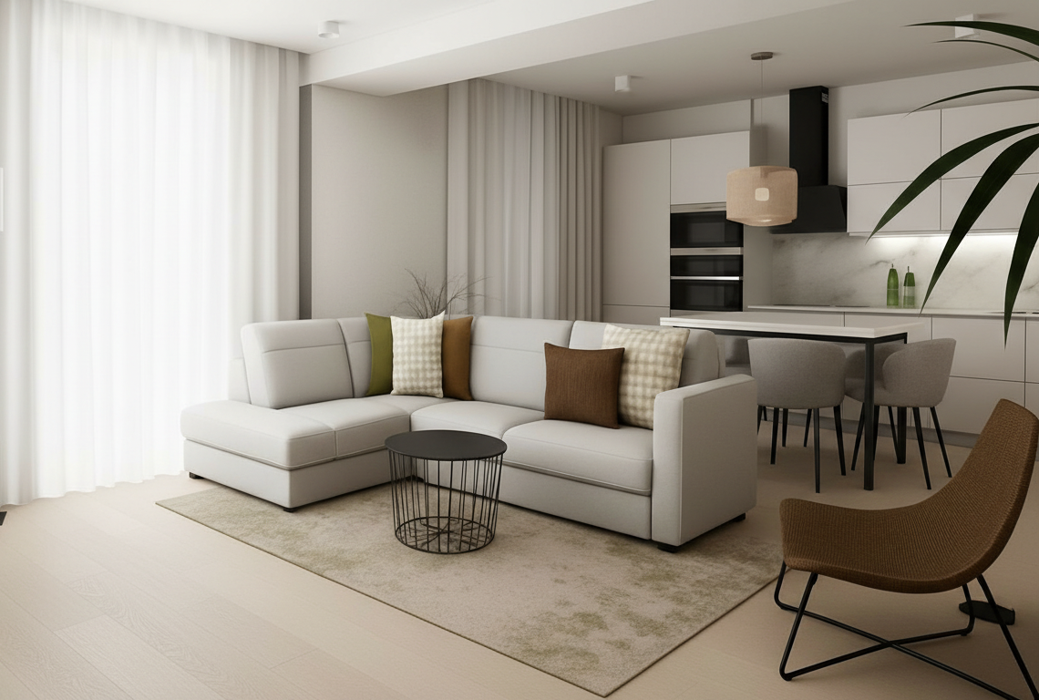 luxury furniture scandinavian with dash of japandi add accesories lamps and lightning and add decorative pillows on sofa and pictures above it please do not leave given space make it natural and fotorealistic