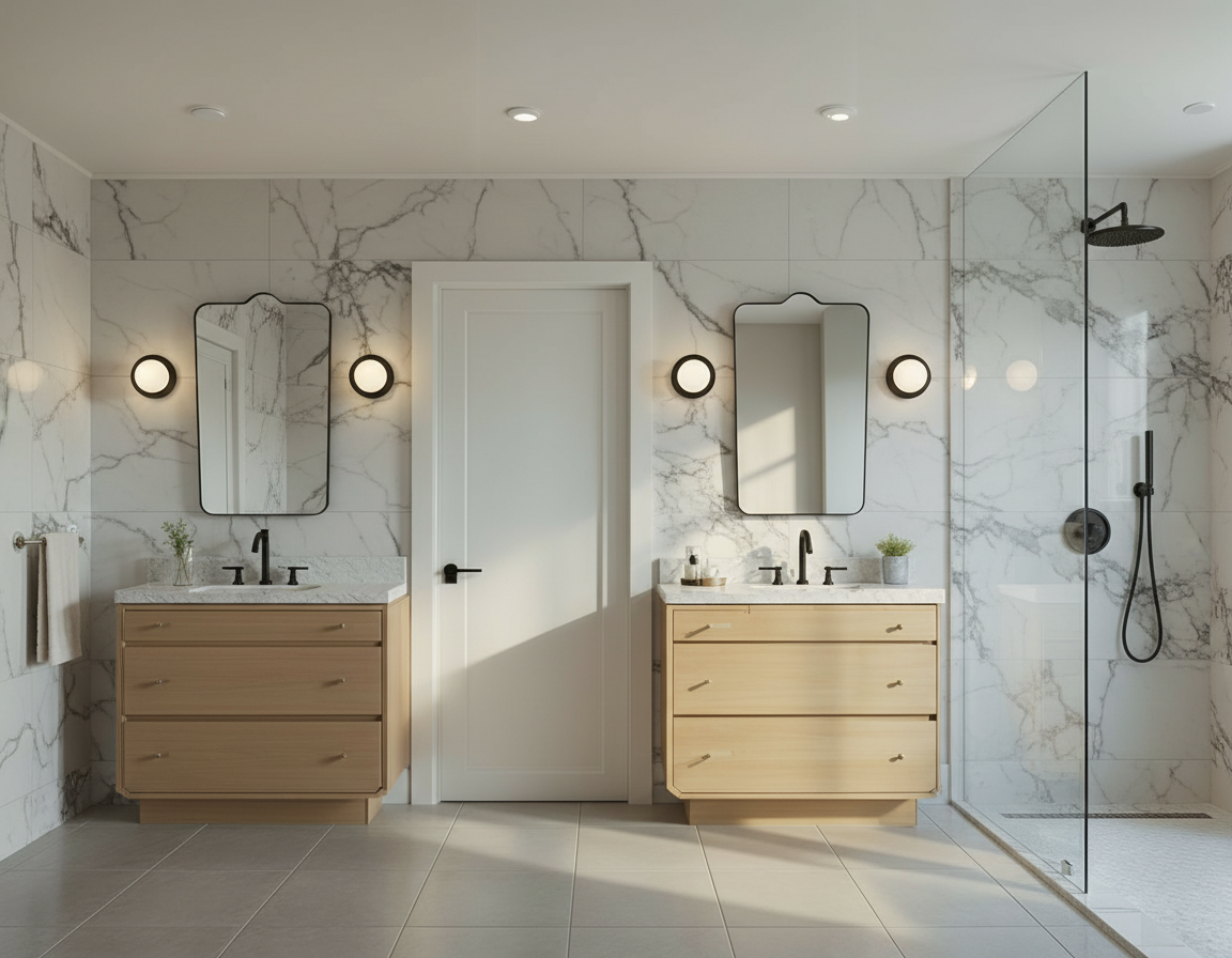 light matte marble floor and plaster walls add people seating at soft plush beige leather bench around planter add a slim metal transition between pattern tile and marble floor