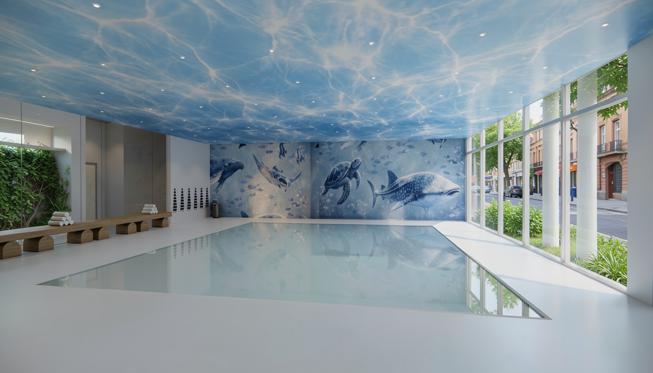 render realisticly leave the wallpaper as is add greenery add trees outside of the window and add a street and skyscraper building outside make the window inside a tinted blue and add small pebble flooring close to the window