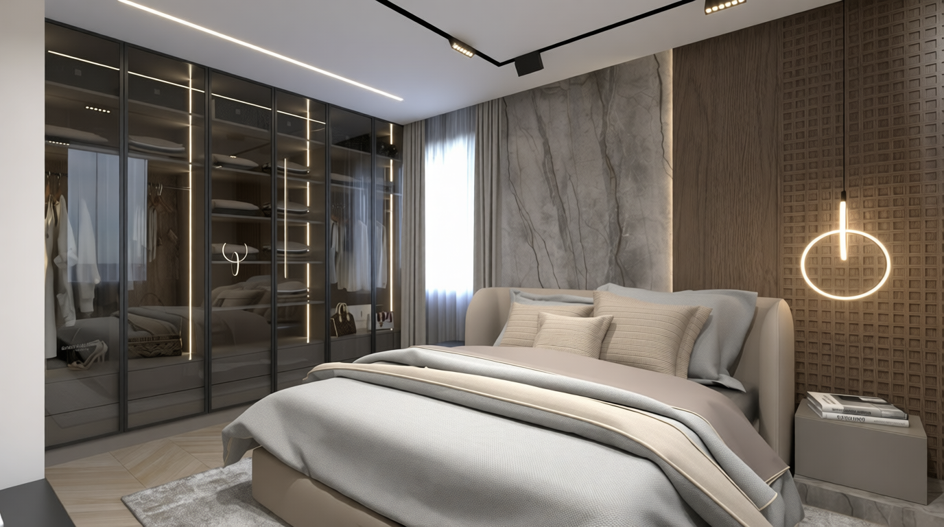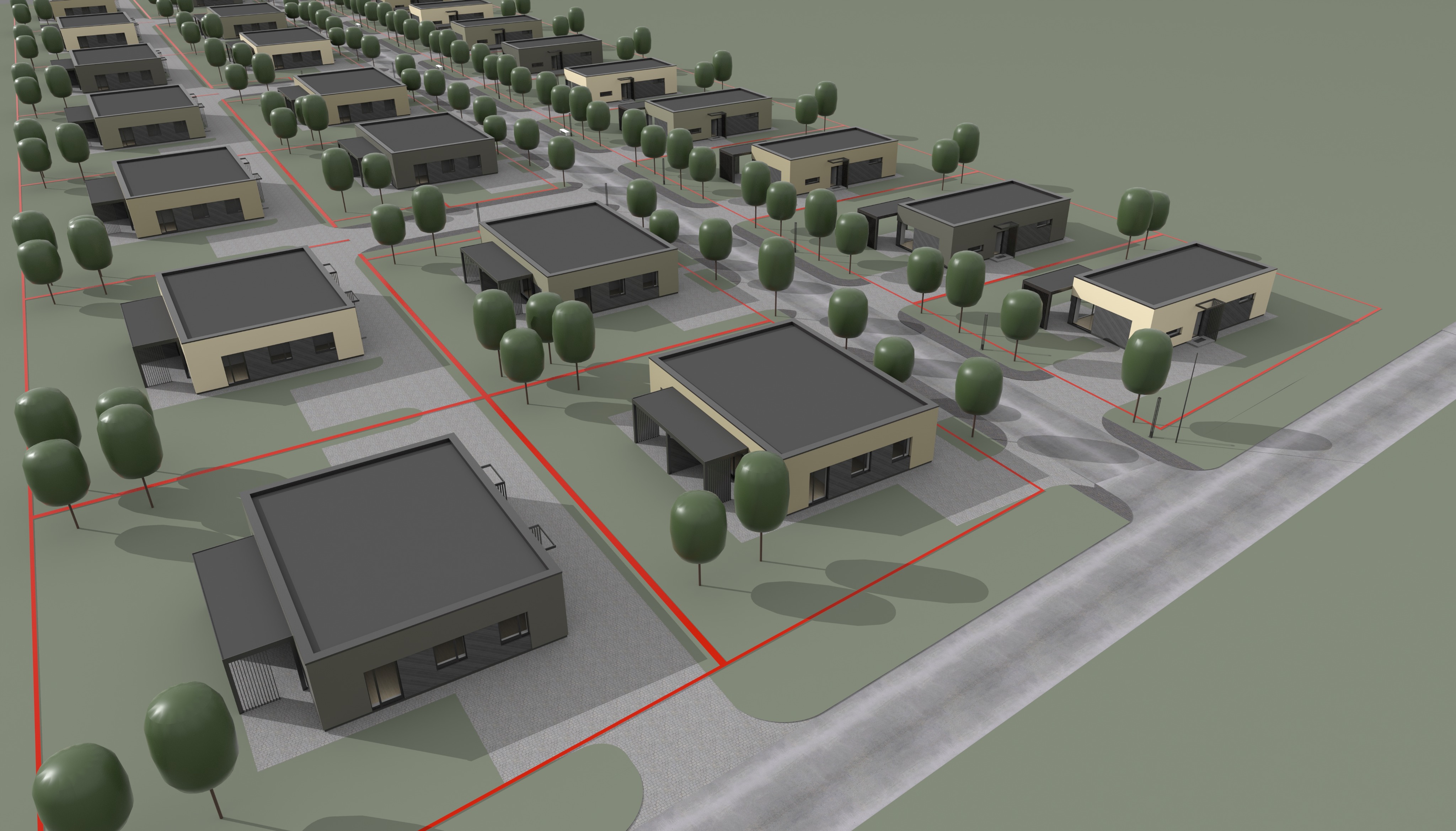 render a realistic suburban neighborhood scene featuring modern minimalist houses each house has a sleek flat roof colored in dark gray with solar panels installed the exterior walls of the houses are a soft and made from plaster complementing the dark gray details 45 degrees angled wood paneling arrange the houses in neat rows along paved areas in a grid pattern center street is asphalt change red lines to dark grey metal fences lush round spherical scots pines with deep green foliage are evenly spaced along the streets casting soft shadows the pathways are a light paving gray while the lawns are a fresh muted green the atmosphere is serene with soft natural lighting creating a peaceful and organized suburban environment add few cars near buildings