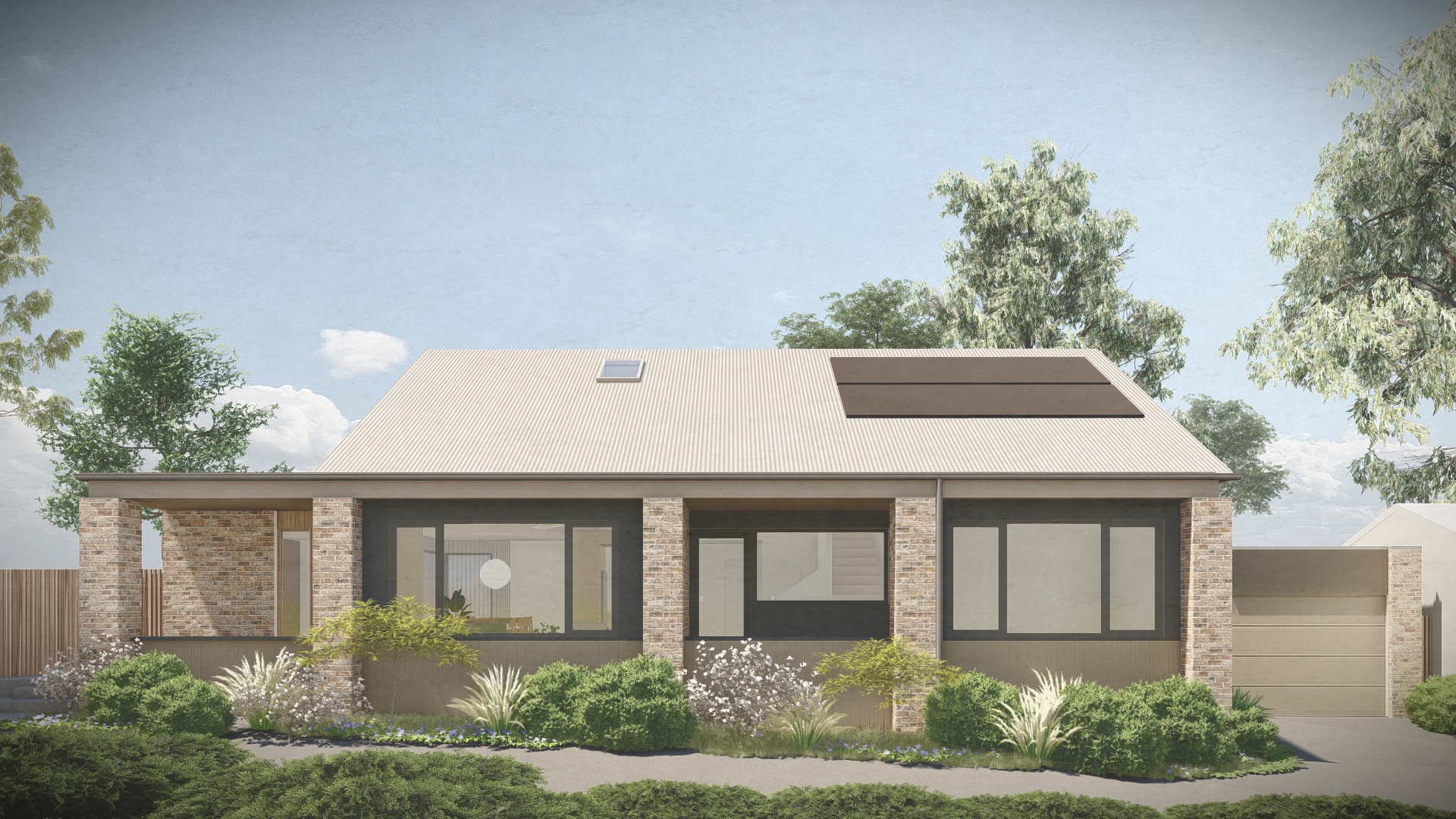 photorealistic architectural rendering of a contemporary australian rural home enhancing an existing lumion base image introduce soft atmospheric depth abundant natural light with a warm low angle sun early morning or late afternoon creating gentle highlights and soft shadows the front of the building needs direct sunlight on an oblique angle refine materiality to feel tactile and true to life metal with subtle reflectivity and imperfections glazing with realistic reflections and slight interior transparency add understated warm interior lighting 2700k 3000k to create a soft glow ensuring it feels natural and not overexposed balance interior and exterior lighting so neither dominates enhance landscaping with slight movement and realism softened edges and subtle tonal variation in grasses and foliage introduce light environmental effects e g faint haze diffused background to increase depth and atmosphere overall mood should be warm calm and evocative slightly ethereal but grounded in realism avoid overly dramatic contrast or stylisation aim for a premium architectural photography aesthetic with a cinematic softness