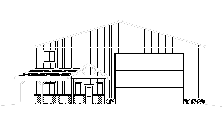 create realistic rendering of this shed charcoal side steel timber post and beam porch grey porch roof steel yellow brick skirt beneath porch and polycarbonate overhead door in a farm setting