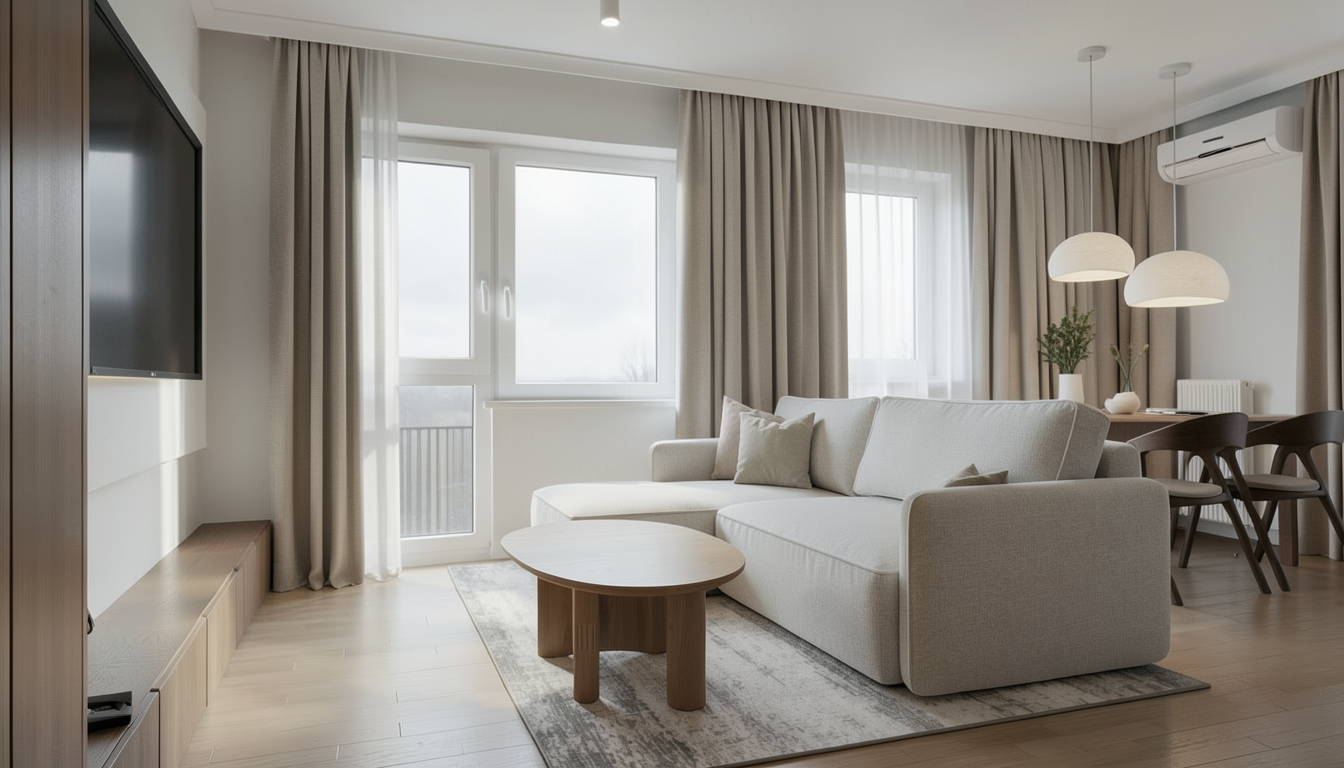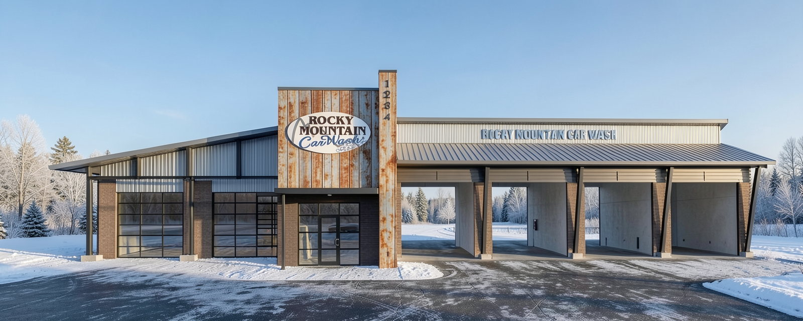 modern rocky mountain industrial architecture contemporary car wash building in bigfork montana architectural presentation rendering artistic but clear and readable not photorealistic single story building with strong horizontal forms and one tall vertical architectural blade element as the main focal point between office and self serve bays medium gray standing seam metal roof weathered steel vertical blade feature ground face brown cmu veneer at automatic bay walls vertical galvalume metal panels above automatic bay entry doors opaque glazed overhead doors with black aluminum frames horizontal metal cladding at self serve bay walls and office areas vertical corrugated metal panels above self serve bays with building lettering clear january morning in bigfork montana crisp blue sky cold clean air subtle frost long soft winter shadows eye level architectural perspective with strong foreground paving leading toward the building clean composition clear material separation strong architectural silhouette presentation style architectural visualization calm refined and professional maintain the same building and camera view increase architectural clarity and material definition keep artistic presentation style asphalt paved site with concrete aprons at wash bays and front office opaque glass in bay doors clear glass at office keep materials and signage text consistant with my image