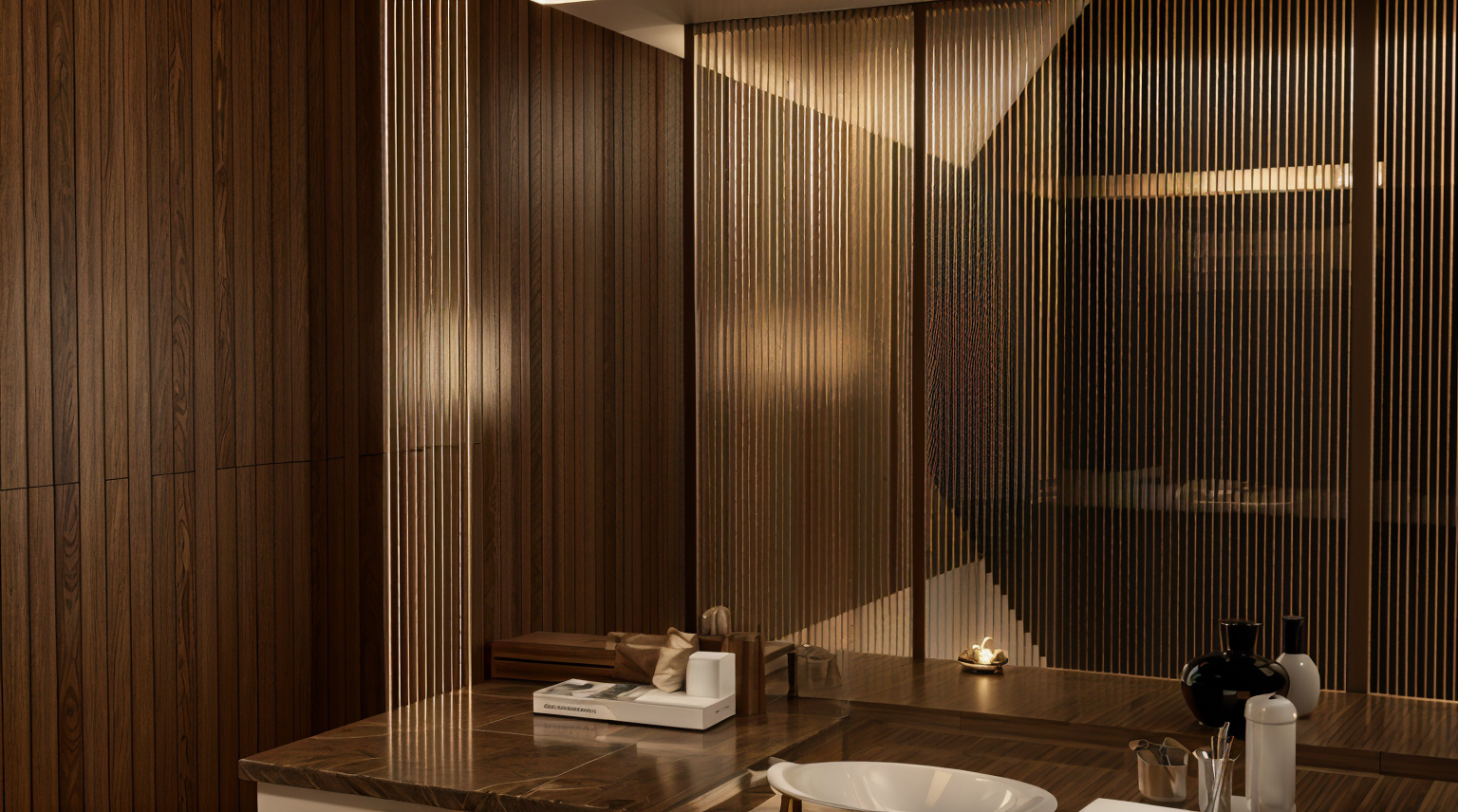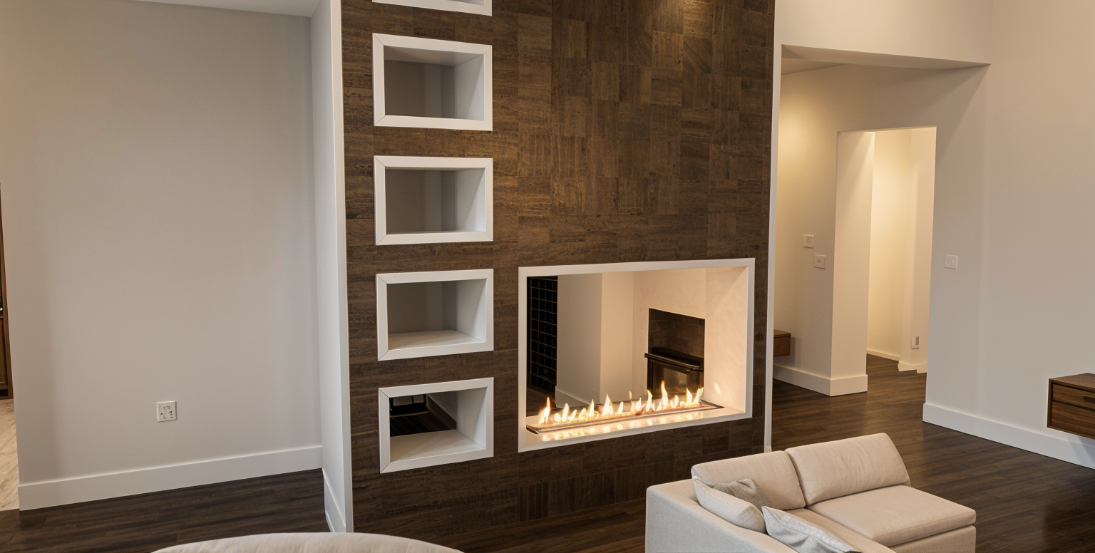 a modern fireplace with bronze stamped textured tile that sparkles in the light white marble with grey veining on left and right sides and around each opening a linear flame in large opening see thorugh the firebox to get a peak of a wine display each opening to have linear lighting to illuminate each box