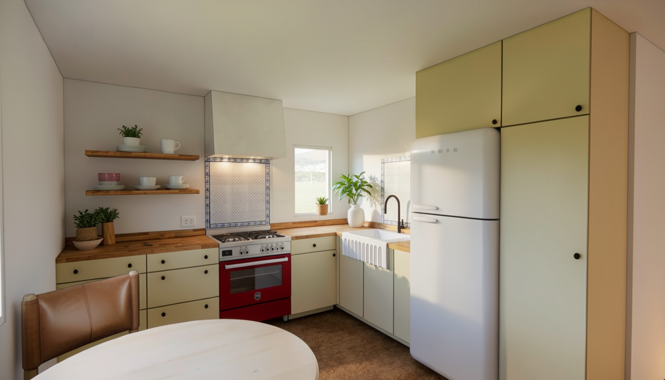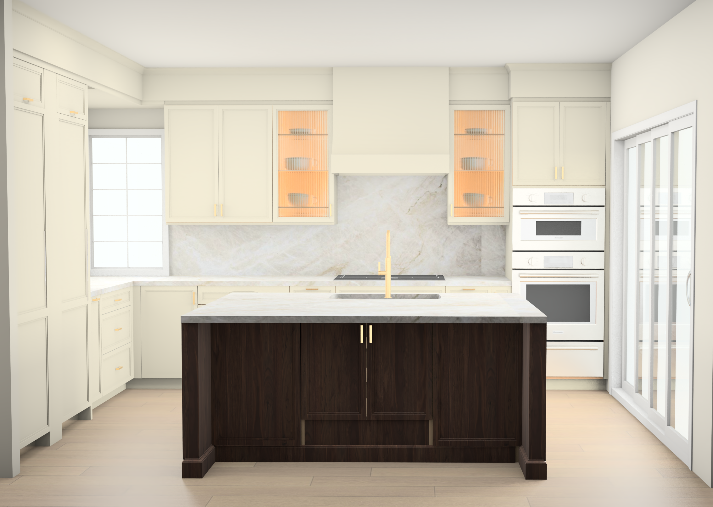 make the rendering more realistic and natural light add trees outside of windows add patio outside of doors and keep patio doors white with glass add 3 bar stools add kitchen accessories