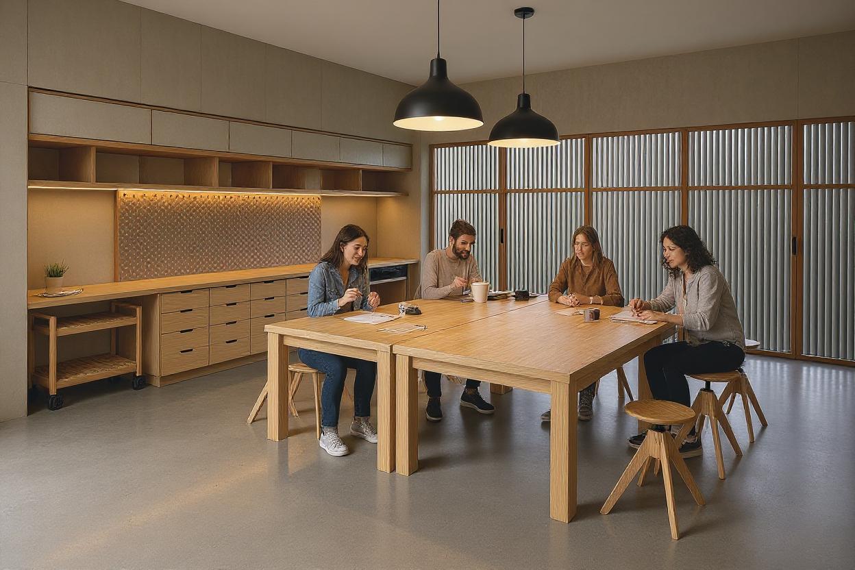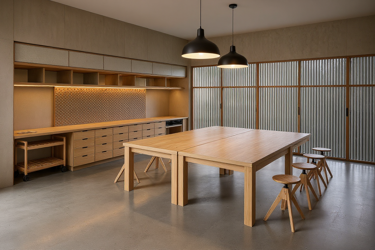 make this minimal makers space as an active environment for students that are creating and building models add subdued sophisticated colors art supplies on the peg board