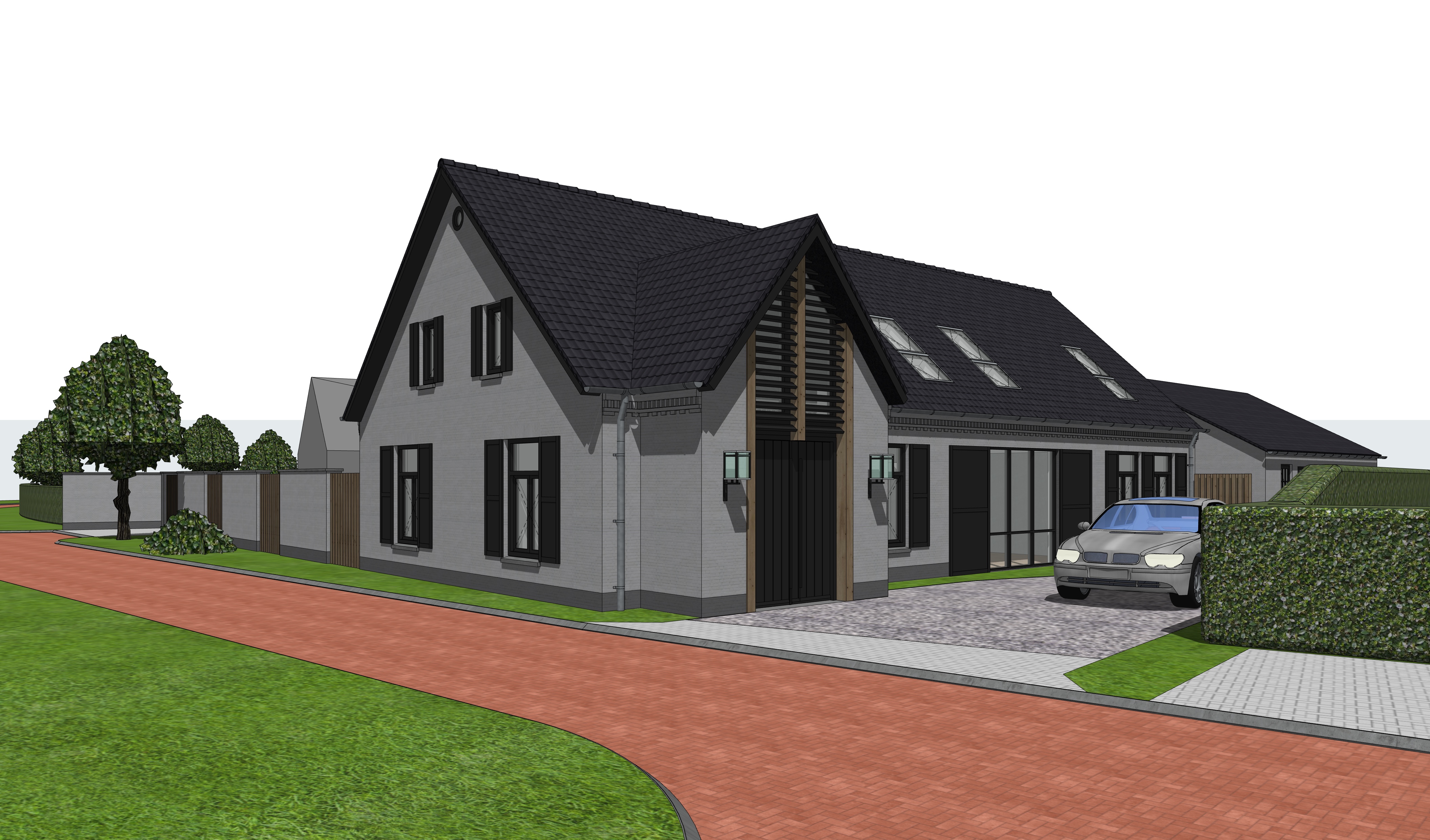 add realisme by enhancing the reflection nature and the lighting the walls of the building are white painted brick with a painted grey plint change the car to a audi a6 avant in dark green make the image in high resolution and dont change the design