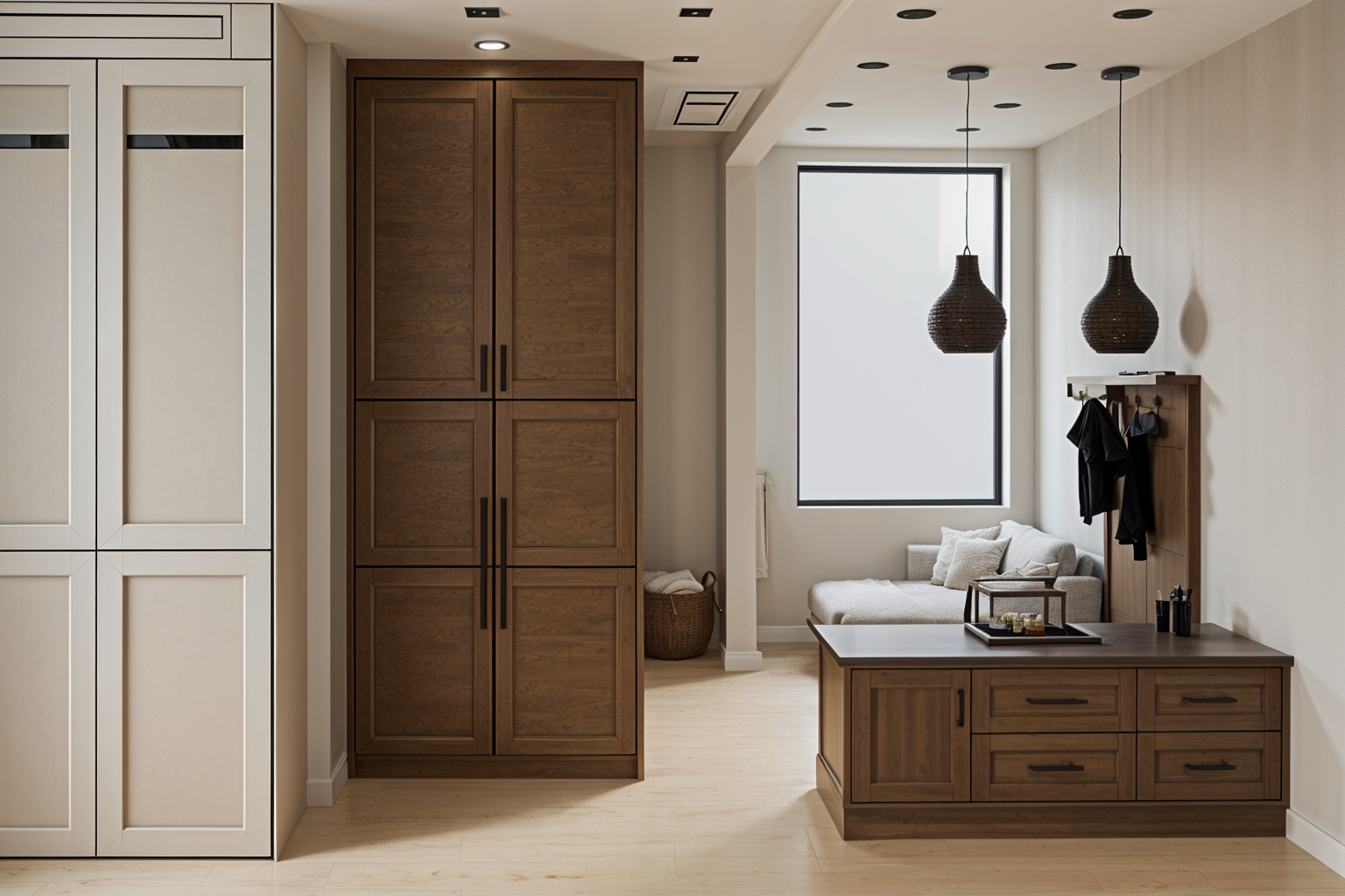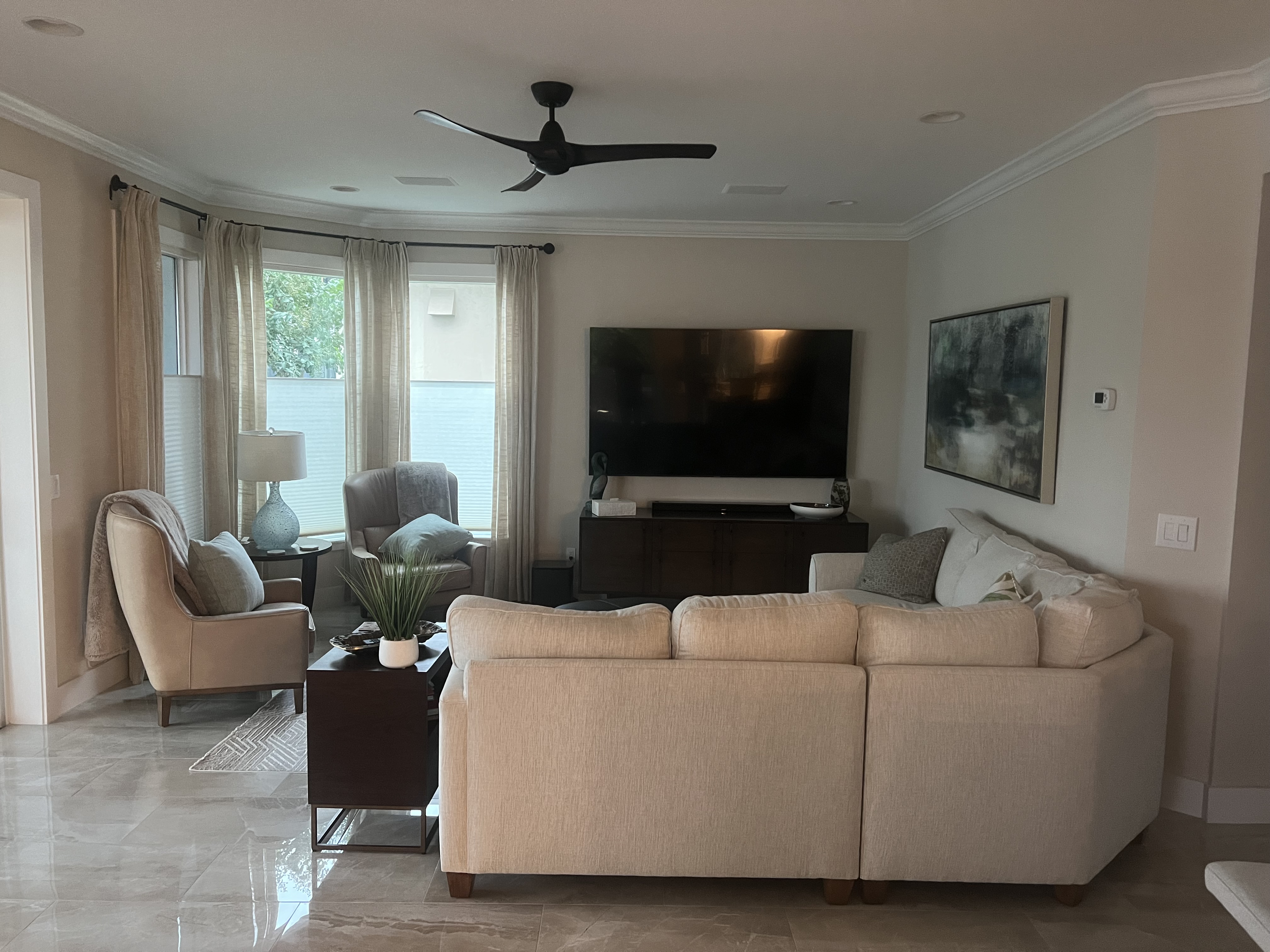 put a tampa bay buccaneer s football scene on the tv screen add a medium blue throw blanket over the back side of the sectional couch add a tall medium blue floor vase on each side of the tv console against the far wall with tall skinny tropical white flowers add a dark brown library table behind the couch with decorative art items add 2 pictures mounted one above the other with blue theme located above the chair on the left side of room add a dark brown floor basket beside the chair on the left with a medium blue throw blanket spilling over