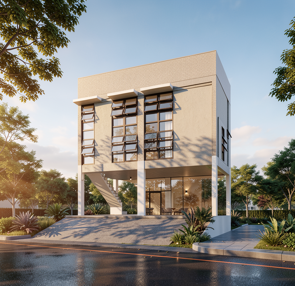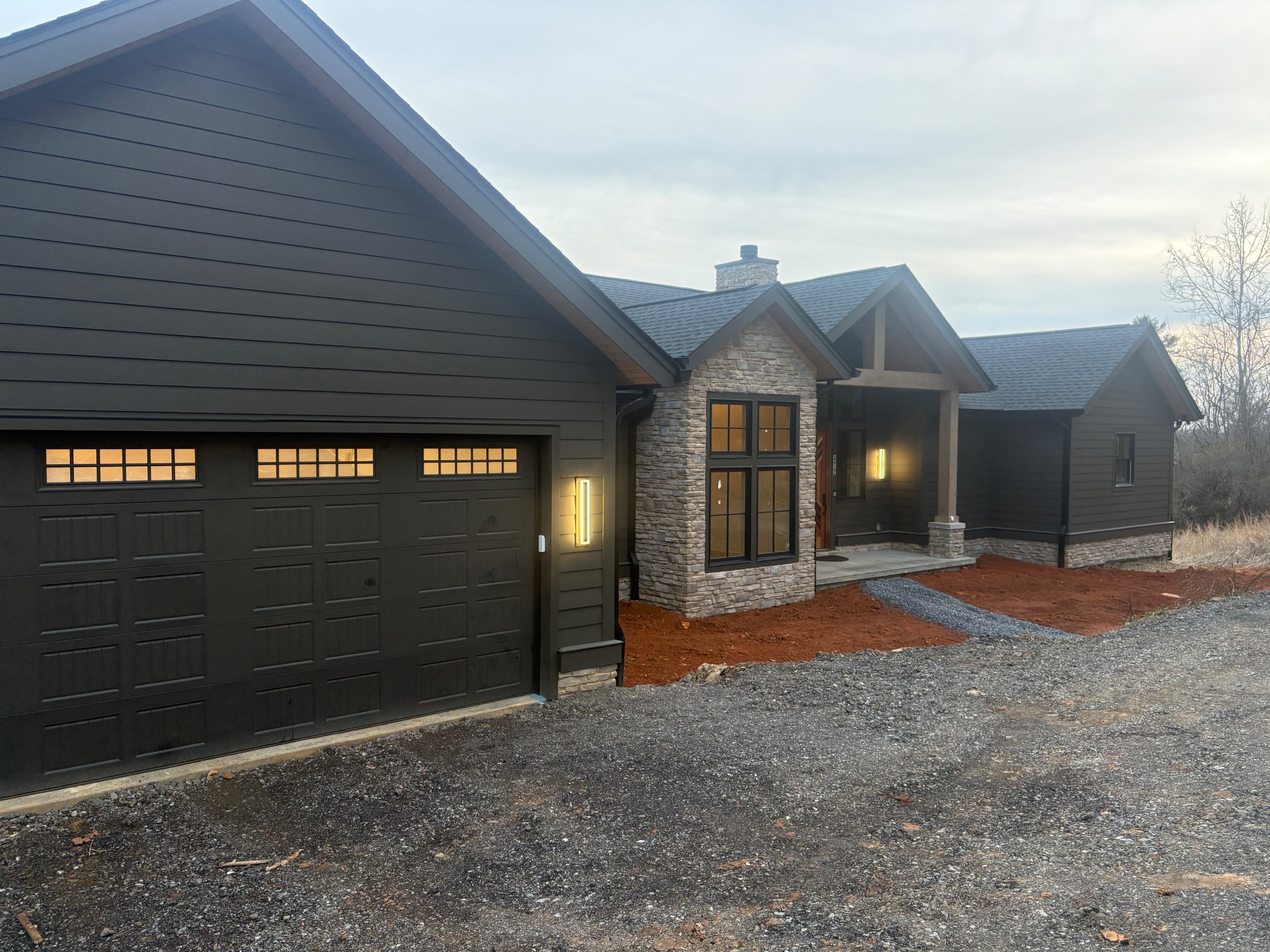 exterior shot create a realistic rendering of a modern house with a dark exterior the house features charcoal gray siding and stone accents with neutral beige tones the windows are large framed in black and warmly lit from inside the garage door is also dark gray with frosted glass panels glowing softly the pathway and driveway are composed of gravel in muted gray tones blending seamlessly with the surroundings the autumn foliage in the distance adds a subtle touch of warmth while the sky is a soft overcast creating a calming and serene atmosphere