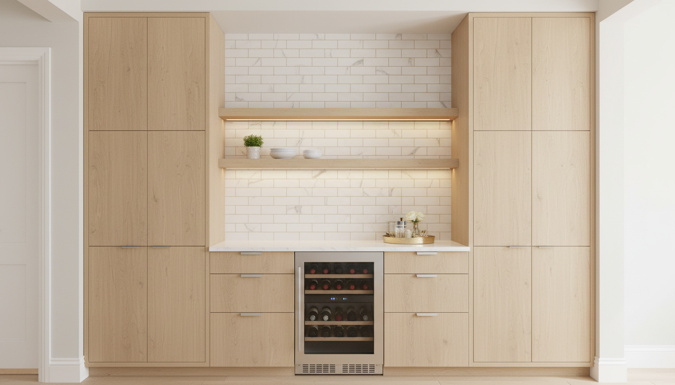 use this sketch to create a kitchen wall rendering full height cabinets and base cabinets in a light stain grade countertops are white quartz full tile backsplash up the wall in the middle with floating shelves the orange shape on the left is a wine beverage cooler the grey shape in the center on the right is a single base cabinet make one of the full height cabinets have open doors with pill out pantry shelves like in the image
