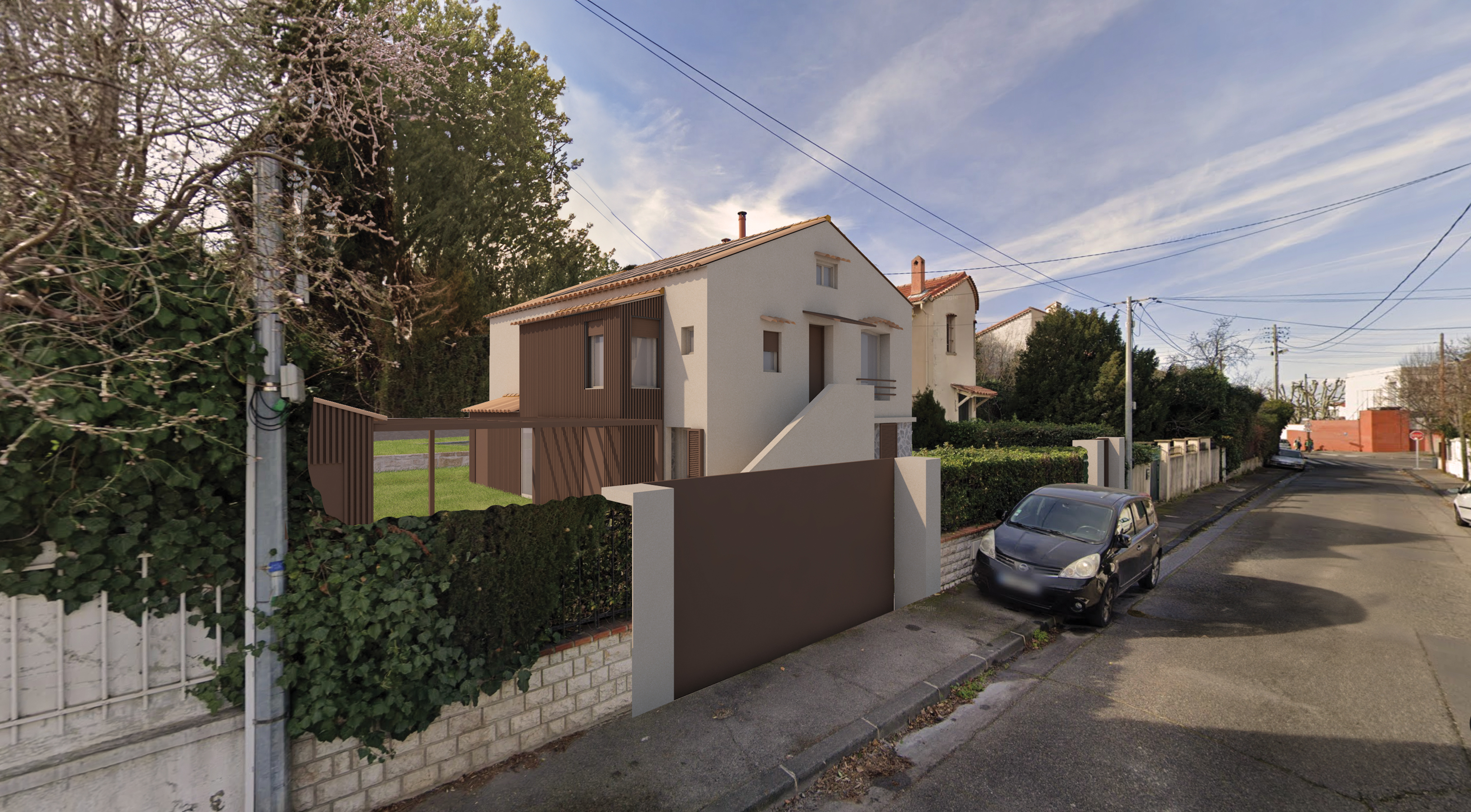 lot of sun light add some jasmine flowers on the pergola and the wood extension reflects in the windows autumn vibes more sun light on the facade