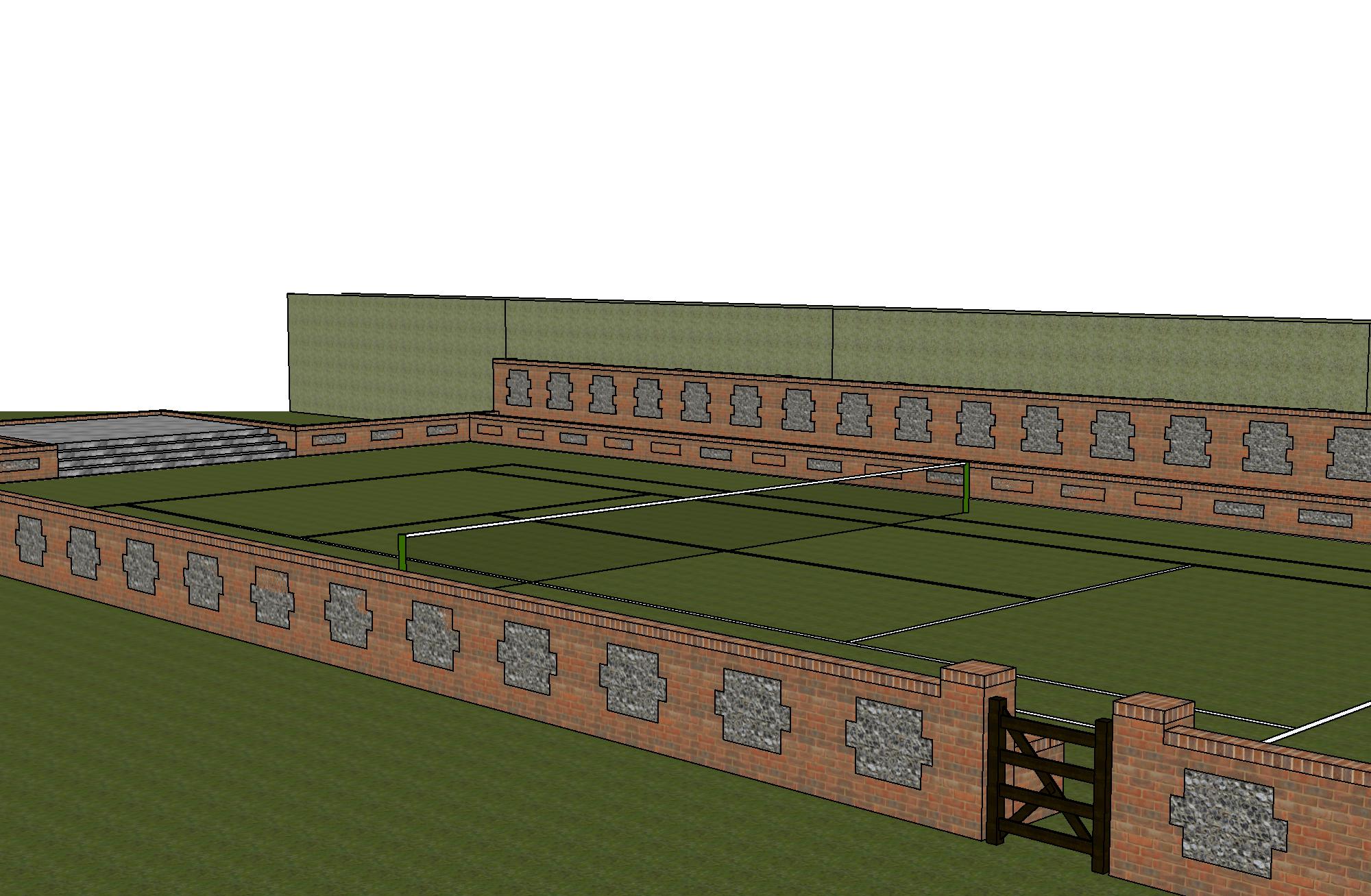 high view of tennis court with brick and flint walls