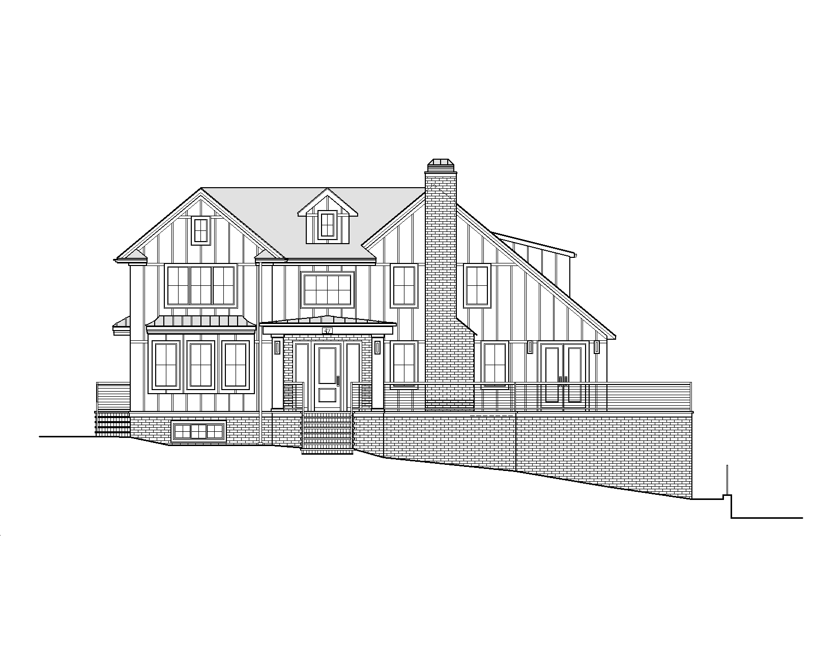 render with a contemporary design dark slate roof modern dark grey color board and batten siding light color brick at the base modern farmhouse style warm sunny day with some trees in the distance have a pathway leading up to the house