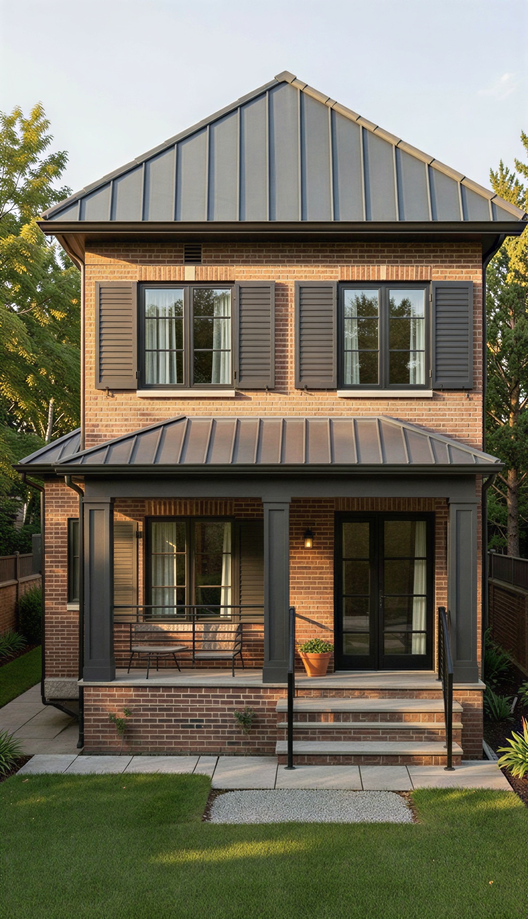 make this exterior lighter with creamy brick and bronze windows make the shutters more modern looking and the front door black