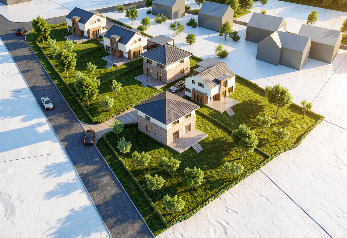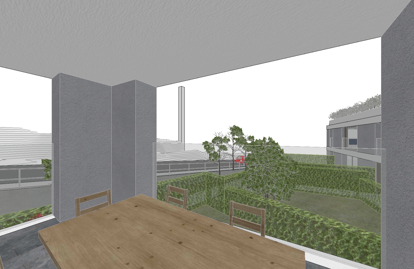 render a modern outdoor patio scene basking in the warm glow of a late mid day sun the atmosphere is serene and inviting with soft sharp sunlight casting gentle shadows across the scene elements walls textured light gray with subtle shadow play fence lush green ivy vibrant and healthy grass well manicured and deep green trees don t change the position of the trees and don t add further trees small mature and leafy providing additional depth with rich green foliage patio bluish gray stone tile flooring cool and elegant furniture natural oak wood table and chairs warm and inviting background don t add any buildings