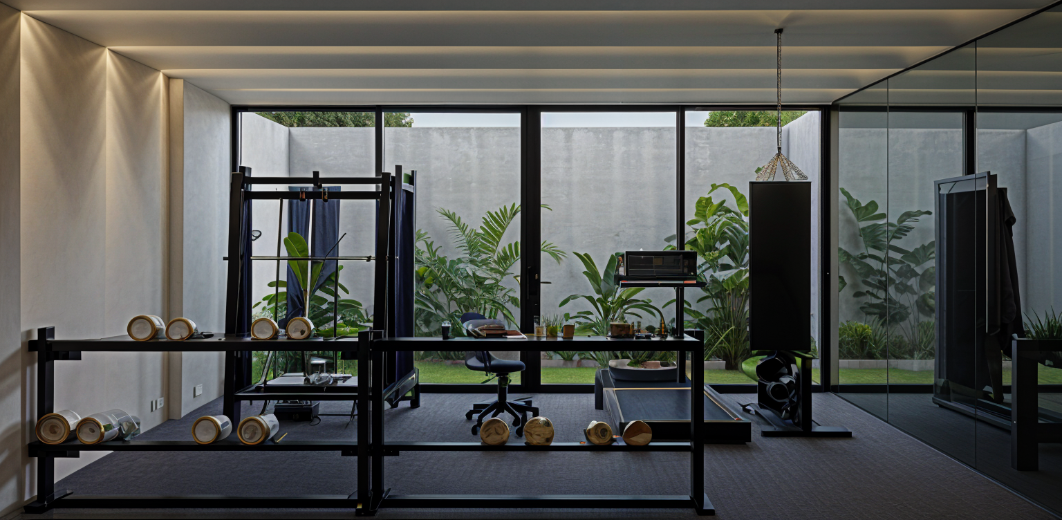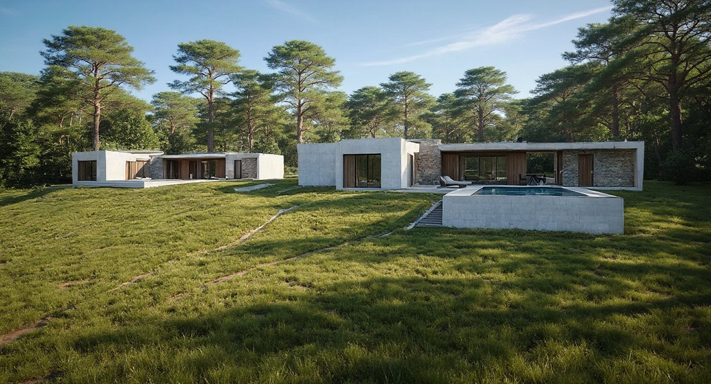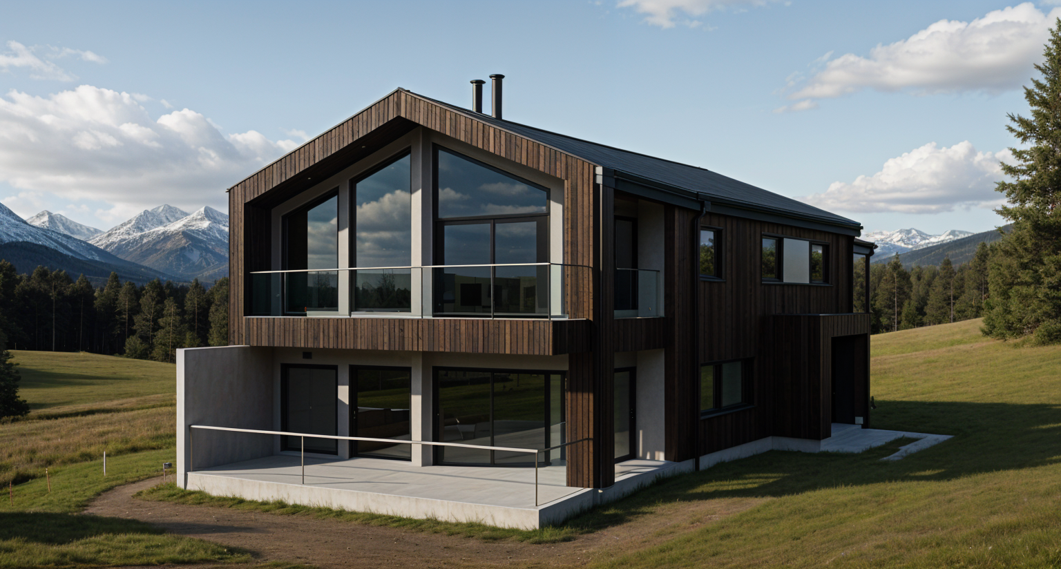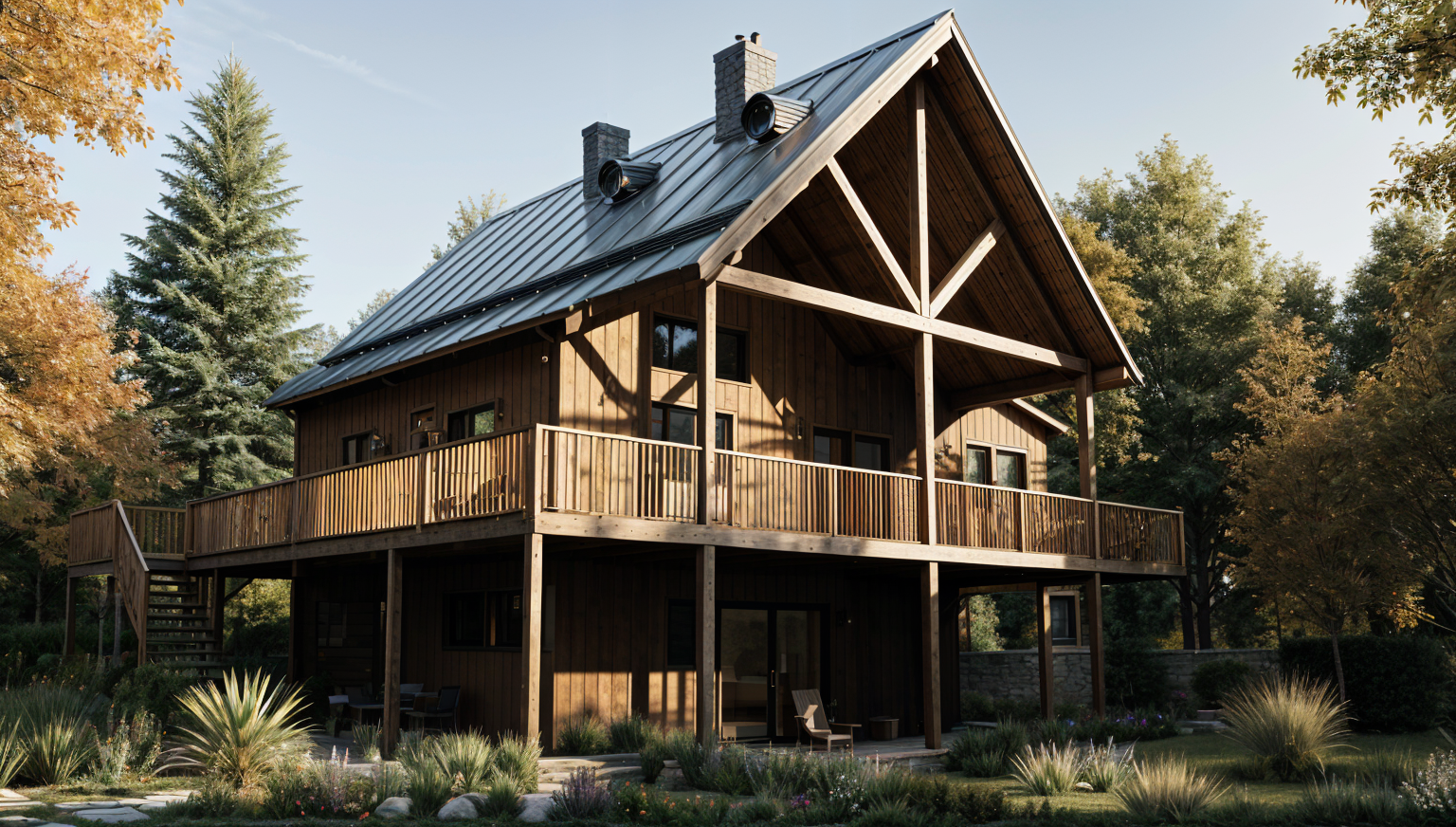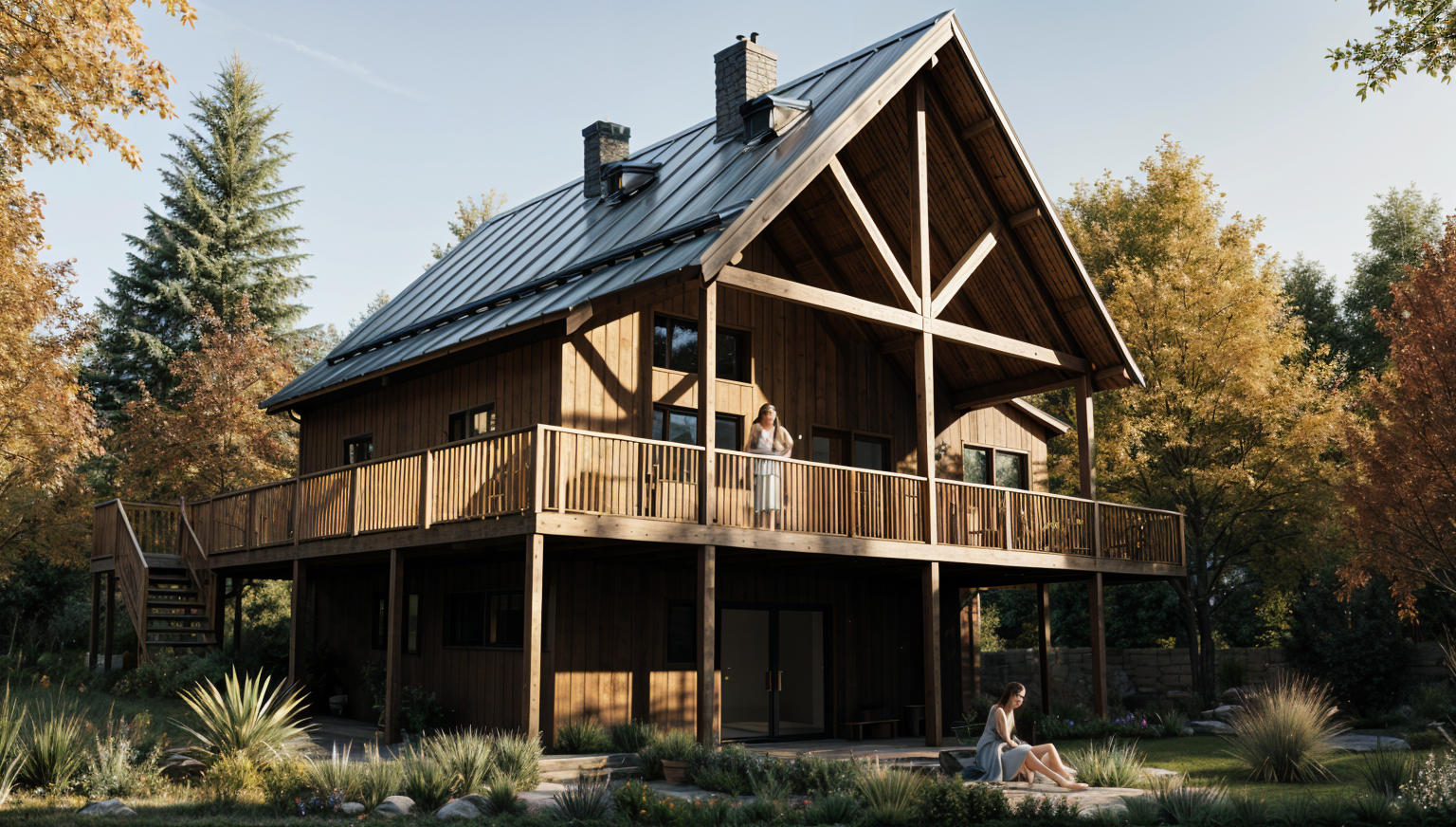create an ultra realistic 4k rendering of a house in summer make the house exterior all in wood the roof black and the window frames black use treated wood for the patio render it in a wooded area of quebec at the beginning of autumn you can include people no reflection on the roof put only one chimney on the roof and only one maximum type roof ventilator