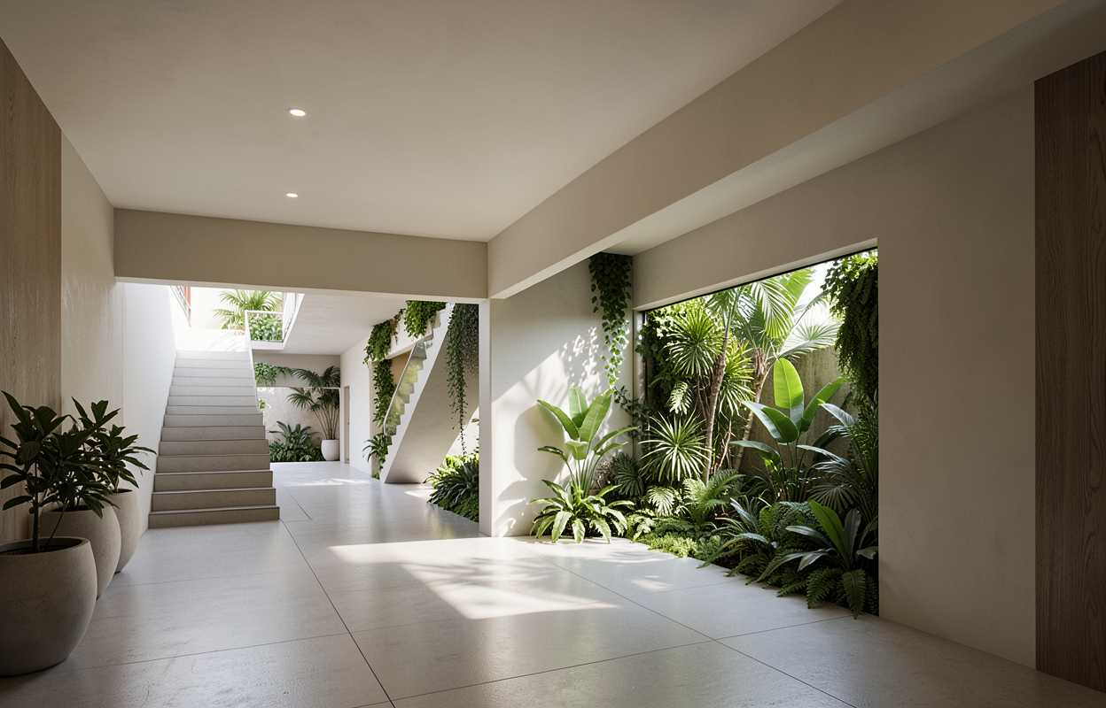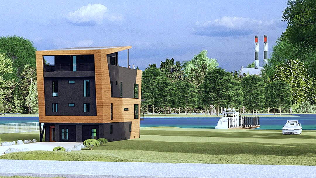 a modern three story house with a mix of black and warm wooden tones surrounded by a lush vivid green landscape tall large leafed trees dot the area creating a serene and inviting atmosphere in the foreground clear turquoise water gently laps against a sandy light beige shore the sky is mostly cloudy with subtle hints of blue peeking through providing a calm and peaceful ambiance add playful energy with children enjoying the open green space near the house