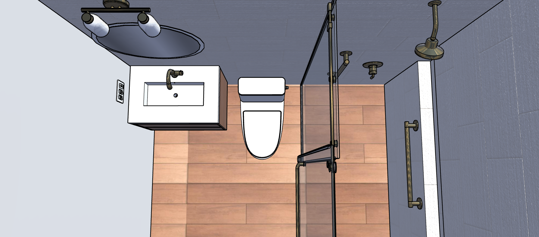 preserve all existing textures geometry materials colors and proportions overall scene is evenly brightened using neutral warm lighting only do not add highlights glow reflections or new light sources lighting comes only from mirror with soft white semi transparent backlit halo warm evenly diffused there is no sunlight nor any light source other than the vanity light and backlit mirror the shower head and all shower fixtures are not light sources and emit no light all metal hardware and accessories are brushed brass the wood tiles are uniform in color with different shades and grains the other tiles are unicolor with 3d horizontal chiseled texture with a color code rgb 234 228 218 walls with no tile on them are painted in a rgb 234 228 218 color the light switches are white