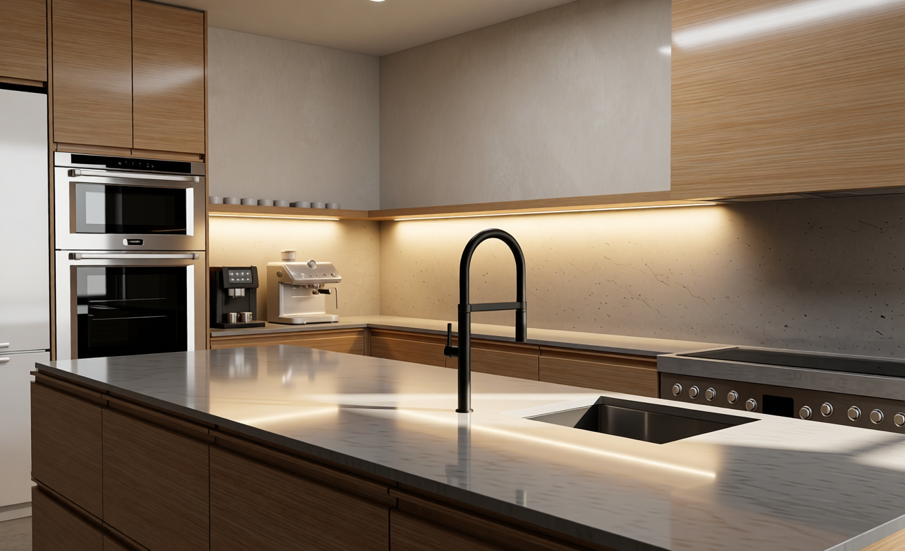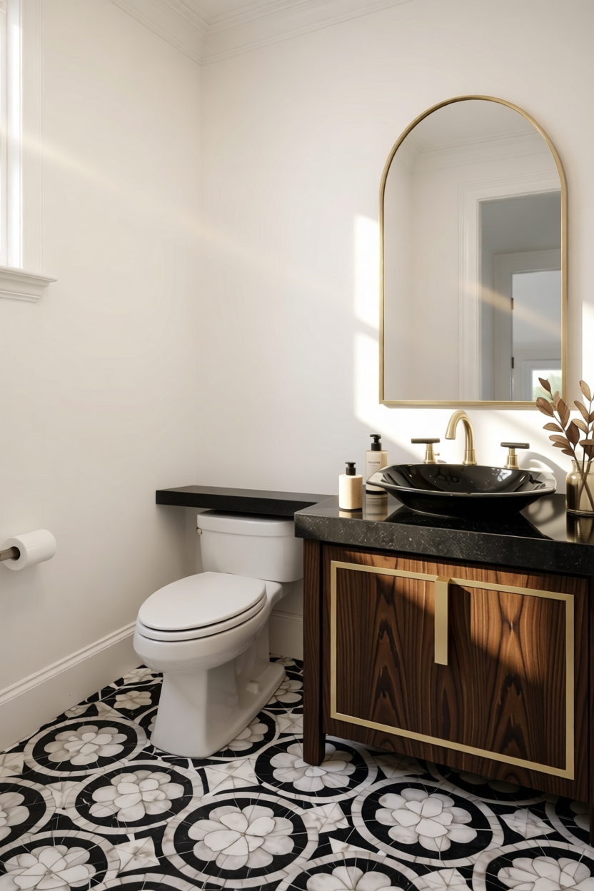 change the wood vanity to a painted black van keep the gold inlay do not alter anything else remove the accessories off of the countertop