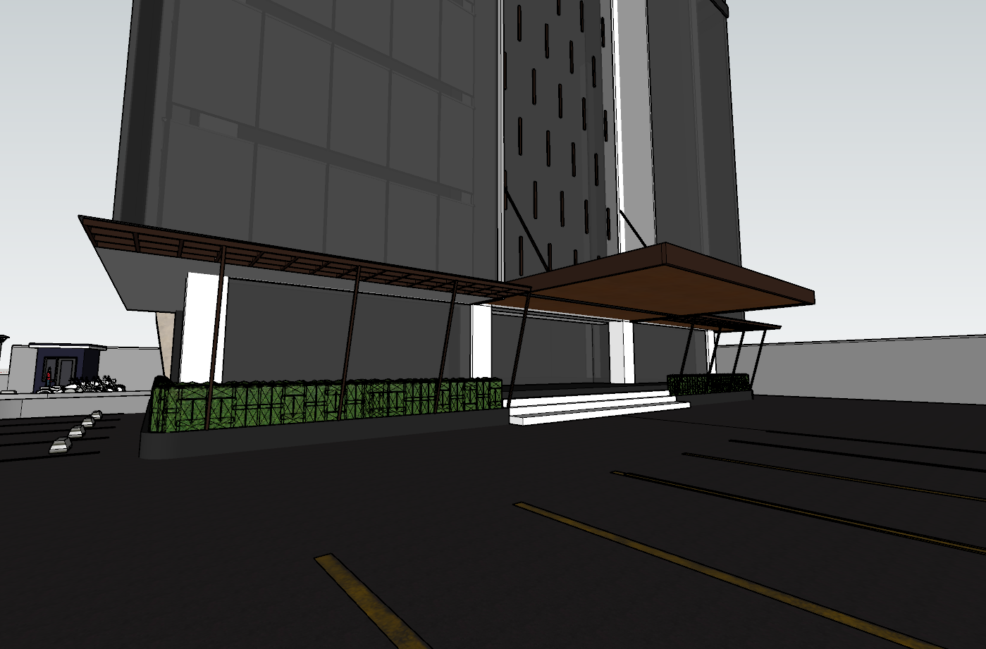 make it into real life photo with very ultra realistic modern style with natural exterior lighting in the city at the afternoon the canopy is acp with wood ceiling