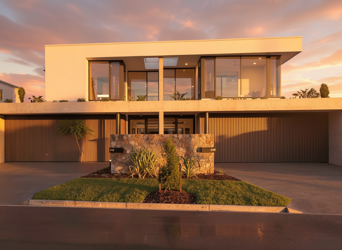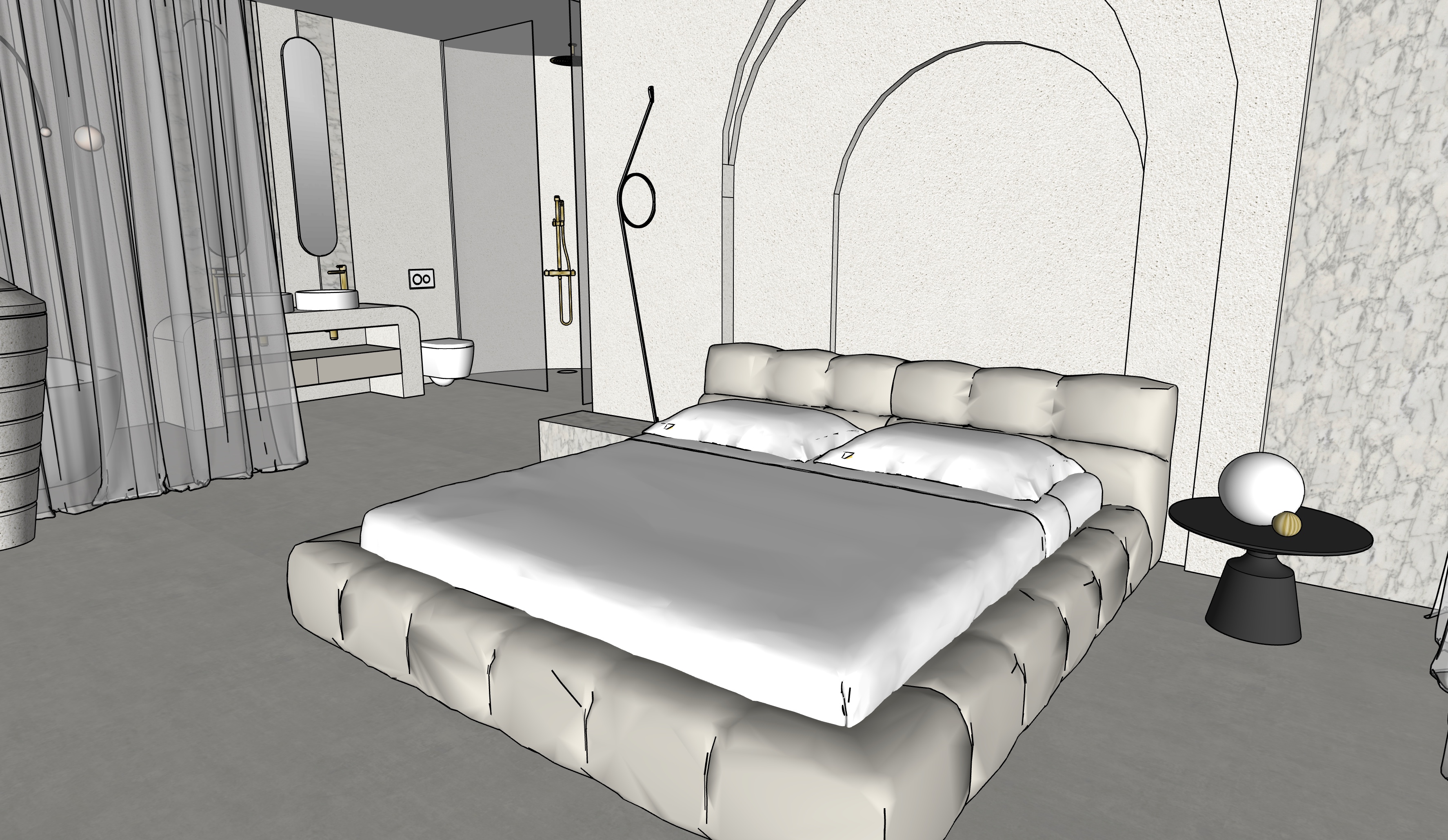 the floor are light micro concrete white bed sheets white translucent curatins