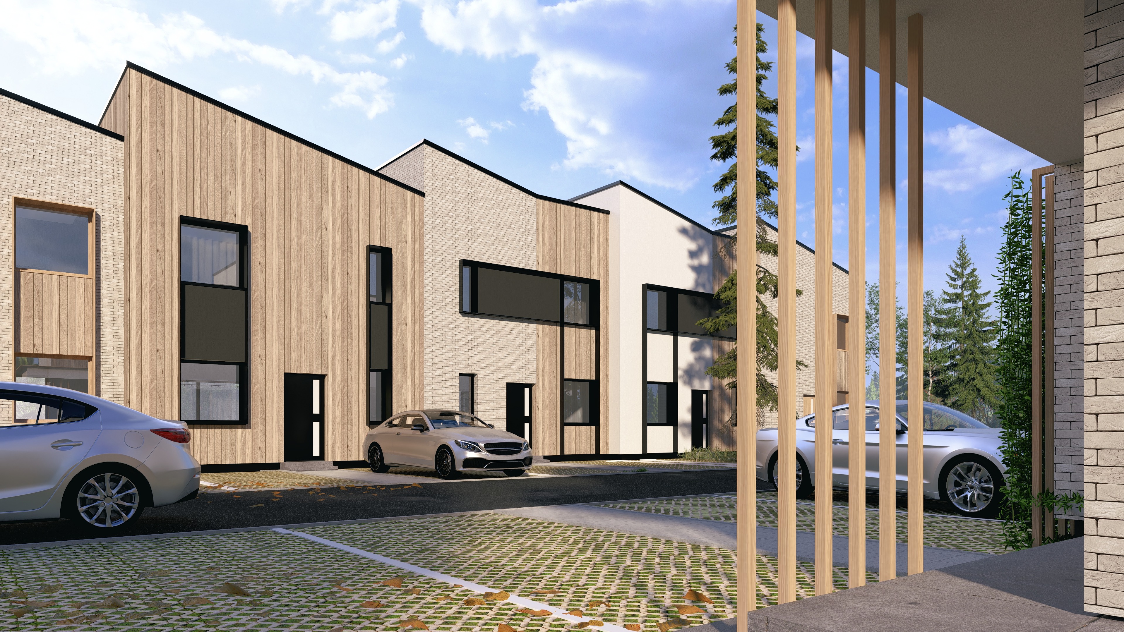 photorealistic architectural render of a modern residential building created strictly based on the provided 3d model preserve the geometry 1 1 maintain the exact building massing proportions fa ade layout openings architectural details and camera perspective absolutely no changes to form scale or framing style ultra realistic architectural visualization cinematic high end high quality pbr materials realistic brick natural wood fa ade cladding metal elements with subtle patina glass with physically accurate reflections and light refraction material realism with preserved color values enhance material realism through surface detail texture resolution micro roughness normal maps and physically based shading while keeping the original material colors unchanged all materials must retain their existing hue saturation and brightness as defined in the source model and reference images no color shifting no warming or cooling of tones no reinterpretation of albedo values realism should come exclusively from texture detail and light interaction not from color alteration lighting realistic daytime lighting in midday conditions neutral daylight with high sun position soft side lighting realistic global illumination gentle light shadow contrast warm interior lighting visible through windows sky and clouds realistic daytime sky with natural color gradient soft blue tones and physically accurate cloud formations light cumulus or thin stratocumulus properly scaled and consistent with midday lighting no dramatic or stylized skies vegetation highly realistic plants with natural variety in species size and color trees shrubs ornamental grasses and ground cover appropriate to a contemporary residential environment correct botanical scale natural growth patterns and subtle irregularity no repetition or artificial symmetry context elements minimal and realistic surrounding elements such as parked vehicles modern neutral colored cars pathways curbs and small urban details all context elements should be correctly scaled unobtrusive and serve only to enhance realism and sense of scale without distracting from the architecture or altering the composition mood atmosphere elegant calm luxurious slightly cinematic premium residential feeling quality ultra sharp focus physically correct lighting realistic shadows natural color grading high dynamic range no noise no blur no artistic stylization clean pure photorealism comparable to top tier competition and developer architectural visualizations 8k ultra detailed professional architectural render
