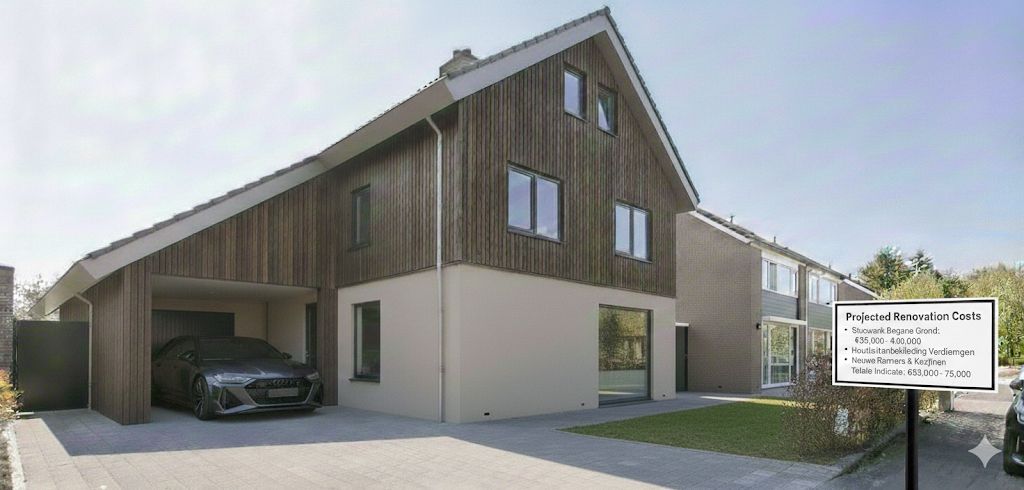 a modern architectural scene featuring a sleek angular house by a serene canal the sky is a vast expanse of soft blues and whites with fluffy clouds creating a tranquil atmosphere the house s exterior is clad in elegant gray stone accentuated with large reflective glass windows the canal water is a deep azure contrasting with lush green shrubs lining the bank the neighboring structures are minimalist in shades of neutral gray the mood is calm and peaceful perfect for a sunny day in a modern suburban setting