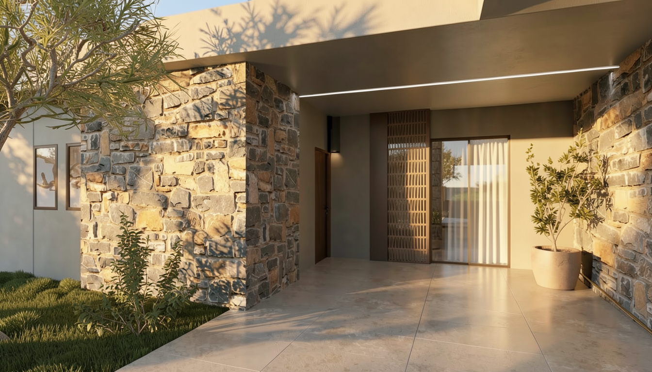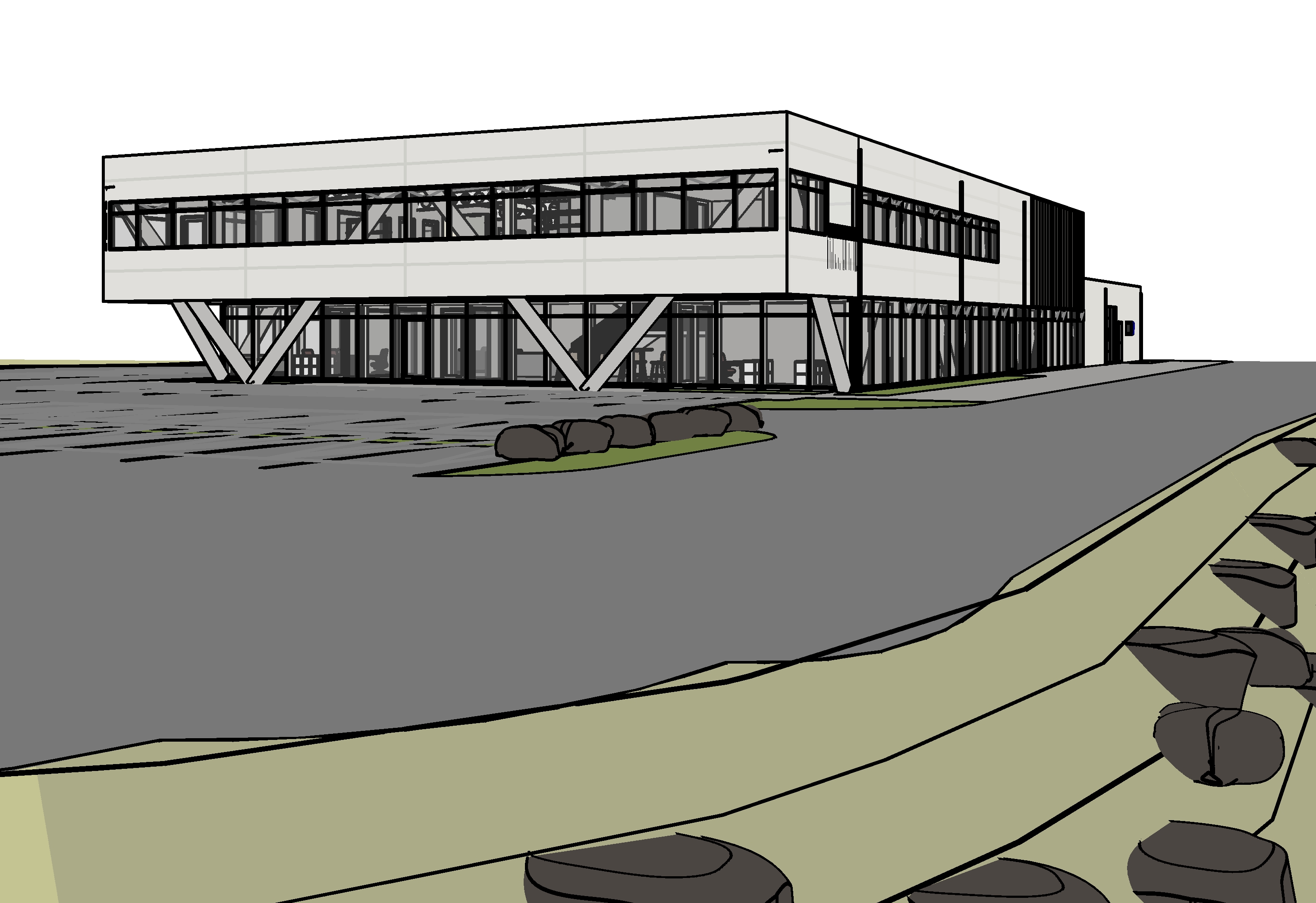 create a photorealistic architectural visualization using the provided reference image as strict geometry the building geometry must remain completely unchanged preserve the exact shape proportions roof geometry facade layout window placement mullion spacing structural columns diagonal steel supports and all architectural elements exactly as they appear in the reference image do not add remove move or redesign any part of the building the camera perspective and composition must remain identical to the reference image the building is a contemporary industrial office and workshop building with a visible steel structural frame and large diagonal steel columns supporting the upper floor the entire ground floor facade consists of large aluminum framed glass curtain wall panels showing the interior structure the second floor contains a continuous horizontal band of windows across the facade exterior materials consist of light smooth facade panels on the upper volume dark graphite steel structural elements and aluminum framed glazing the glazing should have realistic reflections and subtle interior visibility the surrounding ground plane is asphalt parking with subtle white parking markings and realistic surface texture in the foreground there is a small natural hill with many irregular volcanic stones scattered across the terrain the terrain surface should appear as natural mossy ground typical for iceland with soft green moss texture and scattered rocks embedded in the slope the hill must remain smooth and natural without concrete retaining walls or artificial landscape edges the stones should appear as dark natural basalt rocks of different sizes partially embedded in the mossy ground lighting should be soft nordic daylight with slightly overcast sky creating realistic architectural shadows and reflections in the glass facade materials should be highly realistic with subtle imperfections accurate reflections and professional architectural visualization quality the render should enhance materials lighting textures and atmosphere only while strictly preserving all geometry from the reference image do not change building proportions do not change window sizes or positions do not move columns do not alter the roof do not add architectural elements and do not redesign the terrain photorealistic architectural rendering ultra realistic materials sharp details and professional archviz quality avoid modified building shapes new windows removed columns added facade elements artificial landscaping concrete retaining edges or altered terrain geometry