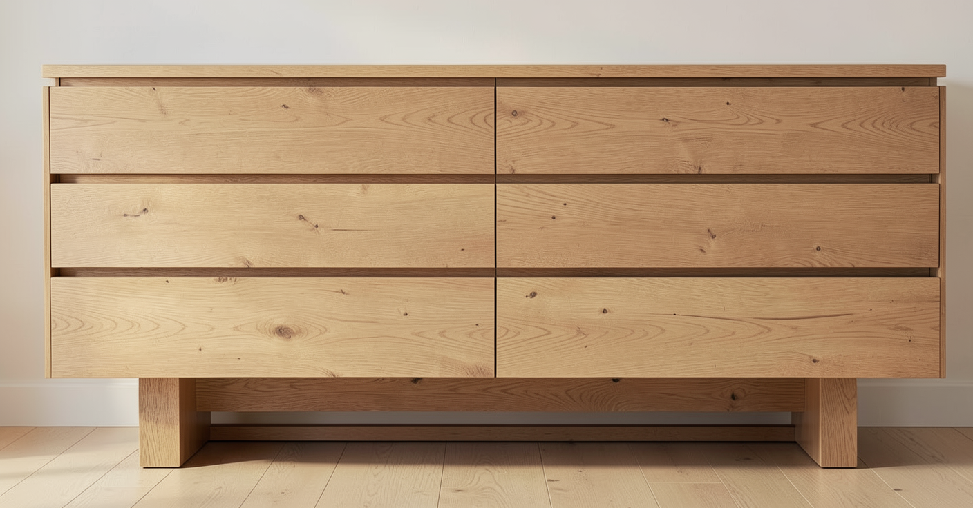 sideboard eiche 6 schubladen mit griffr sung in eiche front aufschlagend seiten von vorne nicht sichtbar sockel balken ohne travers