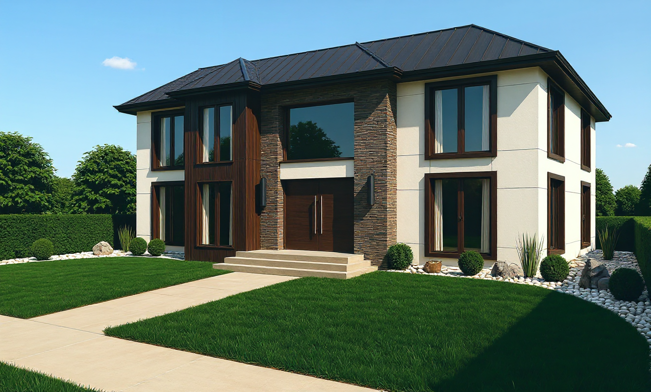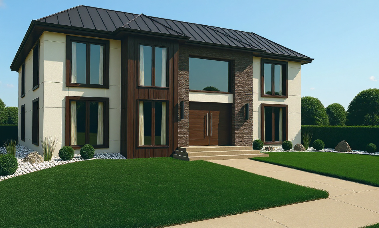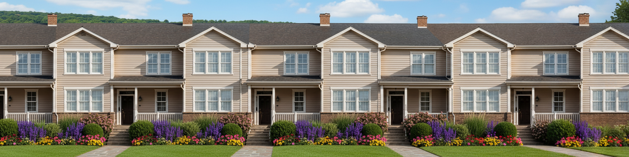 a manicured lawn layered flower beds stone pathway leading to the entrances