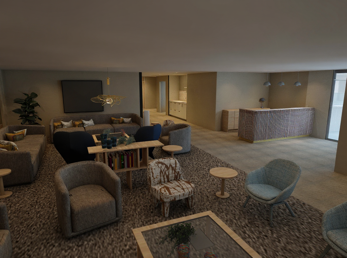 high detail photorealistic exterior rendering of a modern craftsman home with light grain natural wood siding stone accents black soffit fascia and window frames and a black metal roof accent view the home from a slight front left angle at eye level showing realistic depth and roofline dimension scene set on a calm minnesota summer morning with soft directional sunlight gentle shadows and balanced cool warm lighting that enhances the texture of stone and wood grain include a green freshly cut lawn with organic landscaping hydrangeas hostas ornamental grasses boxwoods dwarf spruce and a mulch bed along the foundation driveway in light natural concrete with minor surface texture and reflection from morning dew add a few trees and shrubs in the background clear blue sky with light haze and realistic window reflections