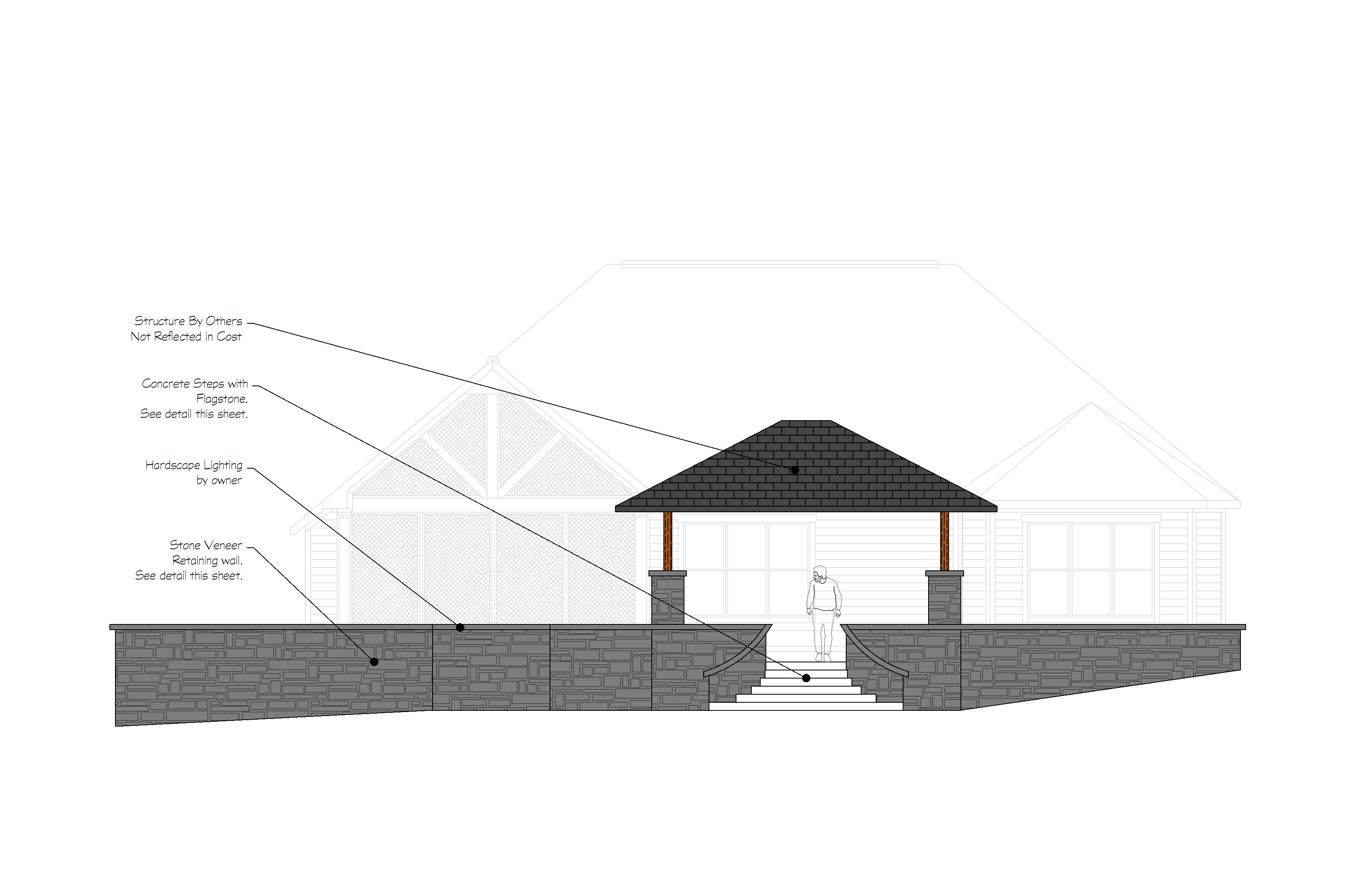 render a serene outdoor structure featuring a central gazebo with a dark slate gray shingle roof the gazebo is supported by rich warm toned wooden posts surround it with a stone veneer retaining wall in deep gray tones concrete steps lead up to the gazebo adorned with natural flagstone in muted earthy colors such as taupe and sand incorporate subtle hardscape lighting to illuminate the area casting a soft glow the atmosphere should be calm and inviting with a clear sky and soft natural lighting to enhance the tranquility of the setting