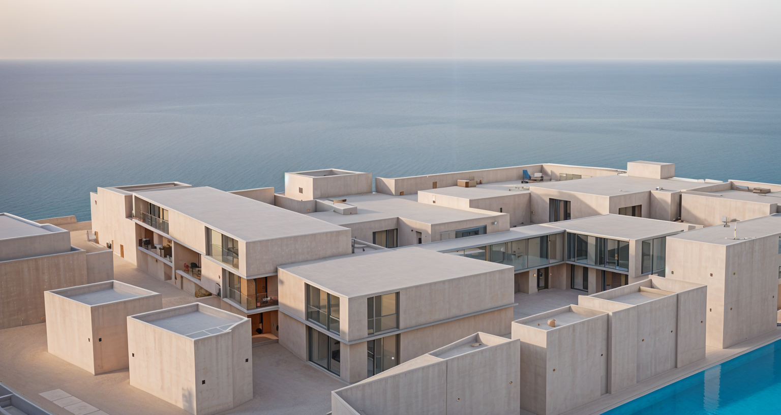 contemporary perspective shot render in chania during sunset with concrete beige walls keep the red parts red architecture