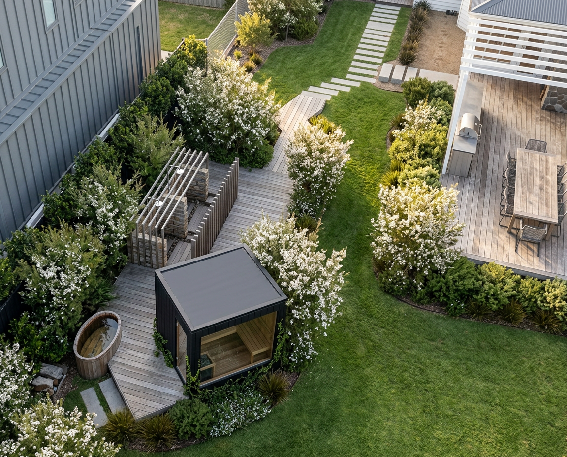show white towels and wetsuits hung low on the inside wall of the outdoor shower